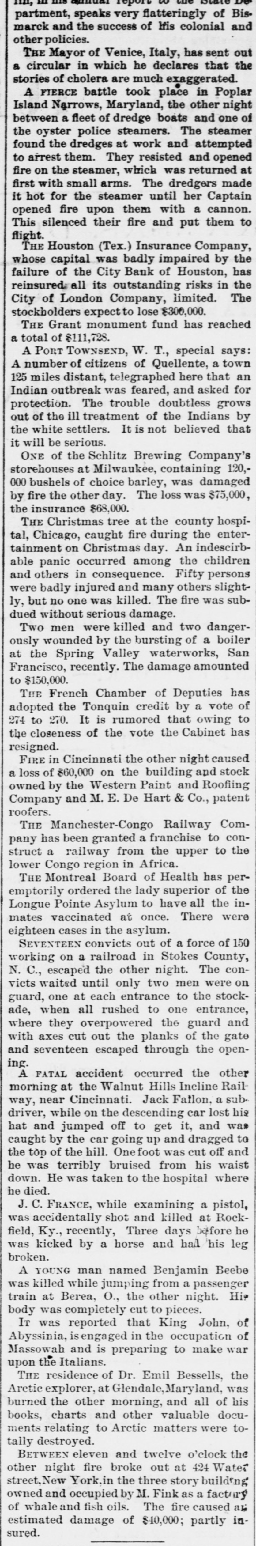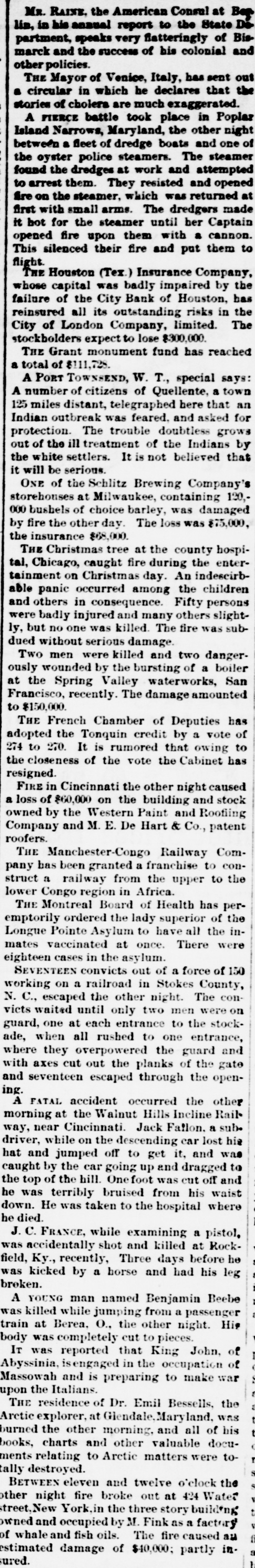 Mr. RAINE, the American Consul at Beg in his annual report to the State Do partment, speaks very flatteringly of Bismarck and the success of his colonial and other policies. THE Mayor of Venice, Italy, has sent out circular in which he declares that the stories of cholera are much exaggerated. A FIERCE battle took place in Poplar Island Narrows, Maryland, the other night between a fleet of dredge boats and one of the oyster police steamers. The steamer found the dredges at work and attempted to arrest them. They resisted and opened fire on the steamer, which was returned at first with small arms. The dredgers made bot for the steamer until her Captain opened fire upon them with a cannon. This silenced their fire and put them to flight. THE Houston (Tex.) Insurance Company, whose capital was badly impaired by the failure of the City Bank of Houston, has reinsured all its outstanding risks in the City of London Company, limited. The stockbolders expect to lose $300,000. THE Grant monument fund has reached total of $111,728. A PORT TOWNSEND, W. T., special says: number of citizens of Quellente, a town miles distant, telegraphed here that an Indian outbreak was feared. and asked for protection. The trouble doubtless grows of the ill treatment of the Indians by the white settlers. It is not believed that will be serious. ONE of the Schlitz Brewing Company's storehouses at Milwaukee, containing 120,bushels of choice barley, was damaged fire the other day. The loss was $75,000, the insurance $68,000. THE Christmas tree at the county hospiChicago, caught fire during the enterainment on Christmas day. An indescirbpanic occurred among the children others in consequence. Fifty persons badly injured and many others slightbut no one was killed. The fire was subwithout serious damage. Two men were killed and two dangerpusly wounded by the bursting of a boiler the Spring Valley waterworks, San Francisco, recently. The damage amounted THE $150,000. French Chamber of Deputies has dopted the Tonquin credit by a vote of to 270. It is rumored that owing to closeness of the vote the Cabinet has esigned. FIRE in Cincinnati the other night caused loss of $60,000 on the building and stock wned by the Western Paint and Roofiing Company and M. E. De Hart & Co., patent oofers. THE Manchester-Congo Railway Comhas been granted a franchise to contruct a railway from the upper to the Congo region in Africa. THE Montreal Board of Health has permptorily ordered the lady superior of the longue Pointe Asylum to have all the invaccinated at once. There were ighteen cases in the asylum. SEVENTEEN convicts out of a force of 150 working on a railroad in Stokes County, C., escaped the other night. The conwaited until only two men were on uard, one at each entrance to the stockwhen all rushed to one entrance, here they overpowered the guard and ith axes cut out the planks of the gate seventeen escaped through the openA FATAL accident occurred the other norning at the Walnut Hills Incline Rail near Cincinnati. Jack Fallon. a subriver, while on the descending car lost his and jumped off to get it, and was aught by the car going up and dragged to top of the hill. One foot was cut off and was terribly bruised from his waist He was taken to the hospital where