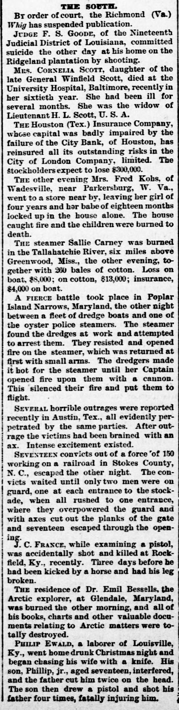 THE SOUTH, By order of court, the Richmond (Va.) Whig has suspended publication. JUDGE F. S. GOODE, of the Nineteenth Judicial District of Louisiana, committed suicide the other day at his home on the Ridgeland plantation by shooting. MRS. CORNELIA SCOTT, daughter of the late General Winfield Scott, died at the University Hospital, Baltimore, recently in her sixtieth year. She had been ill for several months. She was the widow of Lieutenant H. L. Scott, U. S. A. THE Houston (Tex.) Insurance Company, whose capital was badly impaired by the failure of the City Bank, of Houston, has reinsured all its outstanding risks in the City of London Company, limited. The stockholders expect to lose $300,000. THE other evening Mrs. Fred Kohs, of Wadesville, near Parkersburg, W. Va., went to a store near by, leaving her girl of four years and hər babe of eighteen months locked up in the house alone. The house caught fire and the children were burned to death. THE steamer Sallie Carney was burned in the Tallahatchie River, six miles above Greenwood, Miss., the other evening, together with 260 bales of cotton. Loss on boat, $8,000; on cotton, $13,000; insurance, $4,000 on boat. A FIERCE battle took place in Poplar Island Narrows, Maryland, the other night between a fleet of dredge boats and one of the oyster police steamers. The steamer found the dredges at work and attempted to arrest them. They resisted and opened fire on the steamer, which was returned at first with small arms. The dredgers made it hot for the steamer until her Captain opened fire upon them with a cannon. This silenced their fire and put them to flight. SEVERAL horrible outrages were reported recently in Austin, Tex., all evidently perpetrated by the same parties. After outrage the victims had been brained with an ax. Intense excitement existed. SEVENTEEN convicts out of a force of 150 working on a railroad in Stokes County, N. C., escaped the other night. The convicts waited until only two men were on guard, one at each entrance to the stock-ade, when all rushed to one entrance, where they overpowered the guard and with axes cut out the planks of the gate and seventeen escaped through the open-ing. J. C. FRANCE, while examining a pistol, was accidentally shot and killed at Rockfield, Ky., recently. Three days before he had been kicked by a horse and had his leg broken. THE residence of Dr. Emil Bessells, the Arctic explorer, at Glendale, Maryland, was burned the other morning, and all of his books, charts and other valuable documents relating to Arctic matters were totally destroyed. PHILIP EWALD, a laborer of Louisville, Ky., went home drunk Christmas night and began chasing his wife with a knife. His son, Phillip, jr., aged seventeen, interfered, and the father cut him twice on the head. The son then drew a pistol and shot his father four times, fatally injuring him.