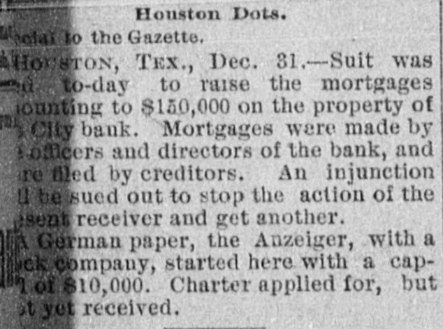 Houston Dots. to the Gazette. AHOUSTON, TEX., Dec. 31.-Suit was to-day to raise the mortgages ounting to $150,000 on the property of City bank. Mortgages were made by sofficers and directors of the bank, and re filed by creditors. An injunction u be sued out to stop the action of the sent receiver and get another. U.S. German paper, the Anzeiger, with a lick company, started here with a capof $10,000. Charter applied for, but st yet received.
