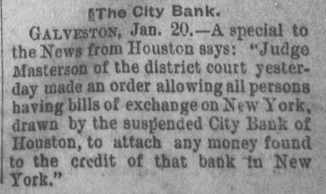 [The City Bank. GALVESTON, Jan. 20.-A special to the News from Houston says: "Judge Masterson of the district court yesterday made an order allowing all persons having bills of exchange on New York, drawn by the suspended City Bank of Houston, to attach any money found to the credit of that bank in New York."