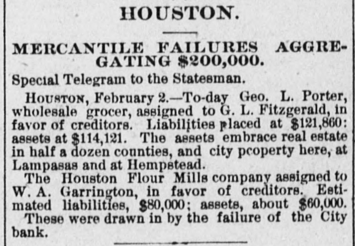 HOUSTON. MERCANTILE FAILURES AGGREGATING $200,000. Special Telegram to the Statesman. HOUSTON, February 2.-To-day Geo. L. Porter, wholesale grocer, assigned to G. L. Fitzgerald, in favor of creditors. Liabilities placed at $121,860: assets at $114,1 121. The assets embrace real estate in half a dozen counties, and city pcoperty here, at Lampasas and at Hempstead. The Houston Flour Mills company assigned to W. A. Garrington, in favor of creditors. Estimated liabilities, $80,000; assets, about $60,000. These were drawn in by the failure of the City bank.