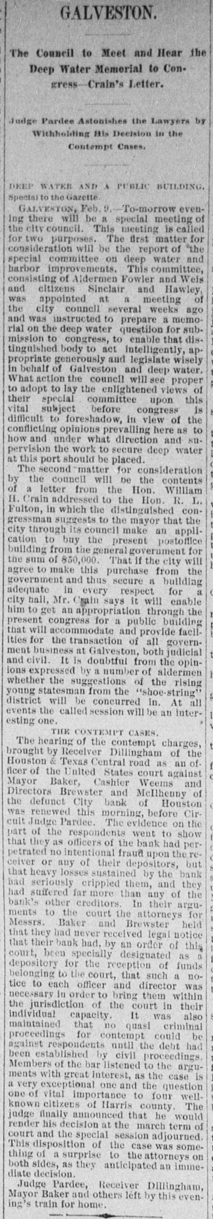 GALVESTON. The Council to Meet and Hear the Deep Water Memorial to Congress-Crain's Letter. Judge Pardee Astonishes the Lawyers by Withholding His Decision in the Contempt Cases. DEEP WATER AND A PUBLIC BUILDING. Special to the Gazette. GALVESTON, Feb. 9.-To-morrow evenIng there will be a special meeting of the city council. This meeting is called for two purposes. The first matter for consideration will be the report of "the special committee on deep water and harbor improvements. This committee, consisting of Aldermen Fowler and Weis and citizens Sinclair and Hawley, was appointed at a meeting of the city council several weeks ago and was instructed to prepare a memorial on the deep water questiion for submission to congress, to enable that distinguished body to act intelligently, appropriate generously and legislate wisely in behalf of Galveston and deep water. What action the council will see proper NA to adopt to lay the enlightened views of their special committee upon this vital subject before congress is difficult to foreshadow, in view of the conflicting opinions prevailing here as to how and under what direction and supervision the work to secure deep water at this port should be placed. ( The second matter for consideration by the council will be the contents of a letter from the Hon. William II. Crain addressed to the Hon. R. L. Fulton, in which the distinguished congressman suggests to the mayor that the city through its council make an application to buy the present postoffice building from the general government for the sum of $50,000. That if the city will agree to make this purchase from the government and thus secure n building ( adequate in every respect for a city hall, Mr. Crain says it will enable him to get an appropriation through the E present congress for a public building that will accommodate and provide facilities for the transaction of all government business at Galveston, both judicial t and civil. It is doubtful from the opinions expressed by a number of aldermen I whether the suggestions of the rising young statesman from the "shoe-string" g district will be concurred in. At all events the called session will be an interesting one. THE CONTEMPT CASES. The hearing of the contempt charges, t brought by Receiver Dillingham of the Houston & Texas Central road as an off ficer of the United States court against o Mayor Baker, Cashier Weems and Directors Brewster and McIlhenny of the defunct City bank of Houston was renewed this morning, before Circuit Judge Pardee. The evidence on the part of the respondents went to show that they as officers of the bank had perpetrated no intentional fraud upon the receiver or any of their depósitors, but that heavy losses sustained by the bank had seriously crippled them, and they had suffered far more than any of the bank's other creditors. In their arguments to the court the attorneys for Messrs. Baker and Brewster held that they had never received legal notice that their bank had. by an order of this
