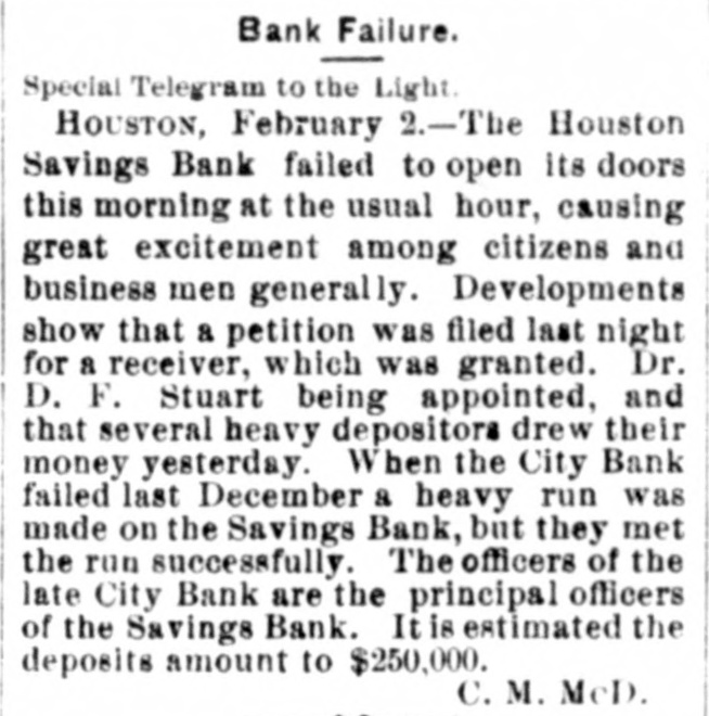 Bank Failure. Special Telegram to the Light. HOUSTON, February 2.-The Houston Savings Bank failed to open its doors this morning at the usual hour, causing great excitement among citizens and business men generally. Developments show that a petition was filed last night for a receiver, which was granted. Dr. D. F. Stuart being appointed, and that several heavy depositors drew their money yesterday. When the City Bank failed last December a heavy run was made on the Savings Bank, but they met the run successfully. The officers of the late City Bank are the principal officers of the Savings Bank. It is estimated the deposits amount to $250,000. C.M.McD.