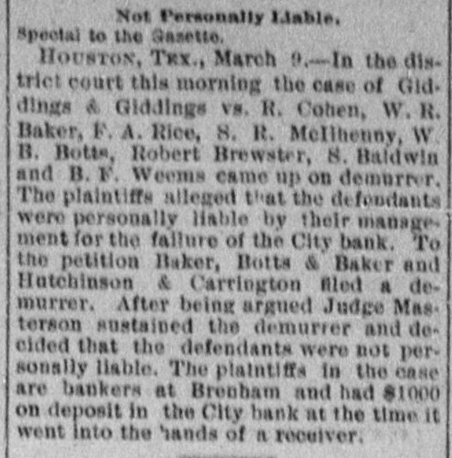 Not Personally Ilable. Special to the Gazette. HOUSTON, Tex., March 9.-In the district court this morning the case of Giddings & Giddings vs. R. Cohen, W. R. Baker, F. A. Rice, S. R. McIlhenny, W. B. Botts, Robert Brewster, S. Baldwin and B. F. Weems came up on demurrer. The plaintiffs alleged that the defendants were personally liable by their management for the failure of the City bank. To the petition Baker, Botts & Baker and Hutchinson & Carrington filed a demurrer. After being argued Judge Masterson sustained the demurrer and decided that the defendants were not personally liable. The plaintiffs in the case are bankers at Brenham and had $1000 on deposit in the City bank at the time it went into the hands of a receiver.