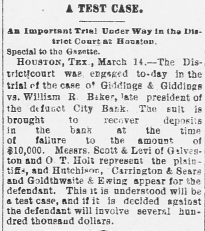 # A TEST CASE. An Important Trial Under Way in the District Court at Houston. Special to the Gazette. HOUSTON, TEX., March 14.--The District court was engaged to-day in the trial of the case of Giddings & Giddings vs. William R. Baker, late president of the defunct City Bank. The suit is brought to recover deposits in the bank at the time of failure to the amount of $10,000. Messrs. Scott & Levi of Galveston and O. T. Hoit represent the plaintiffs, and Hutchison, Carrington & Sears and Goldthwaite & Ewing appear for the defendant. This it is understood will be a test case, and if it is decided against the defendant will involve several hundred thousand dollars.