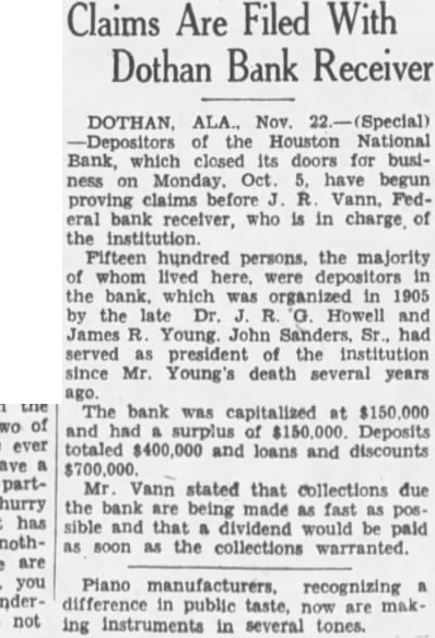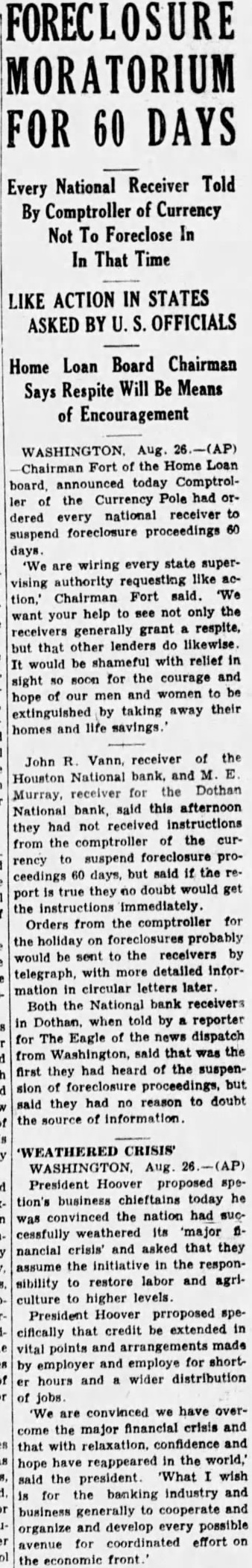 John Vann, receiver the Houston National bank. and the Dothan Murray, receiver for said this afternoon National bank, they had not received instructions comptroller of the curfrom the suspend foreclosure prorency ceedings days, but said if the doubt would get port true they the instructions immediately. Orders from the comptroller for the holiday on foreclosures be sent to the receivers by would with more detailed infortelegraph, mation in circular letters later. Both the National bank receivers in Dothan. when told by reporter The Eagle of the news dispatch from Washington, said that the first they had heard of the suspension of foreclosure proceedings, but said they had no reason to doubt the source of