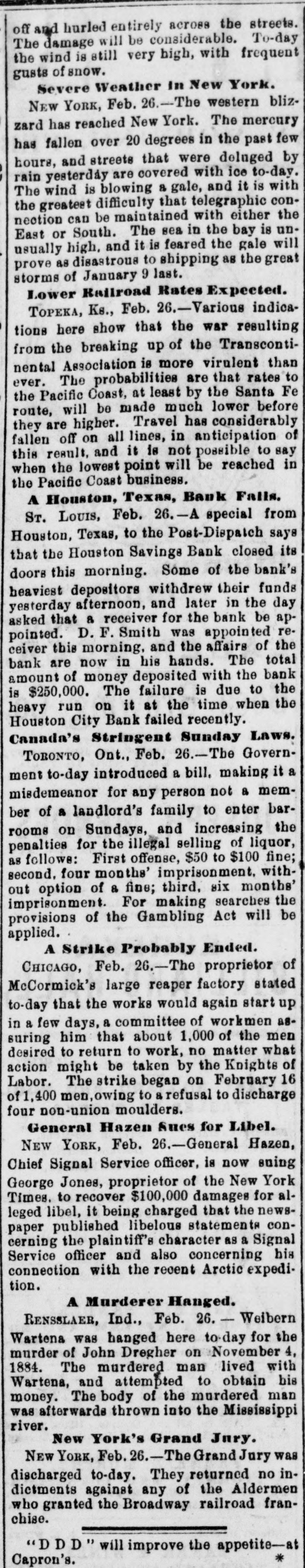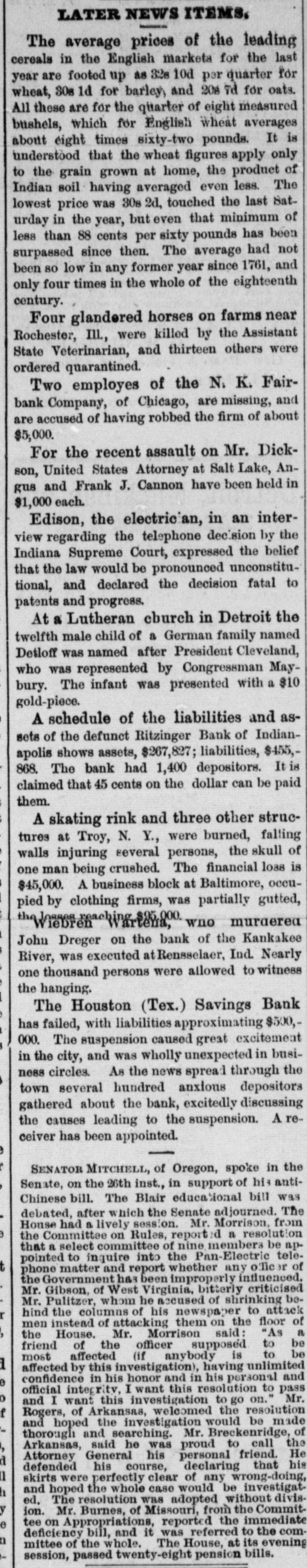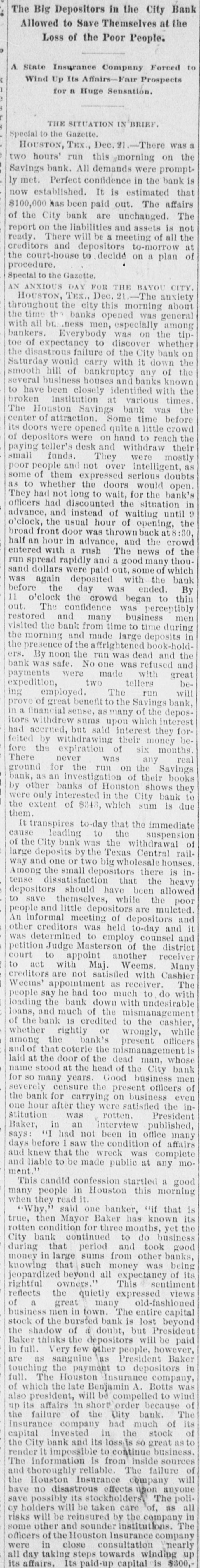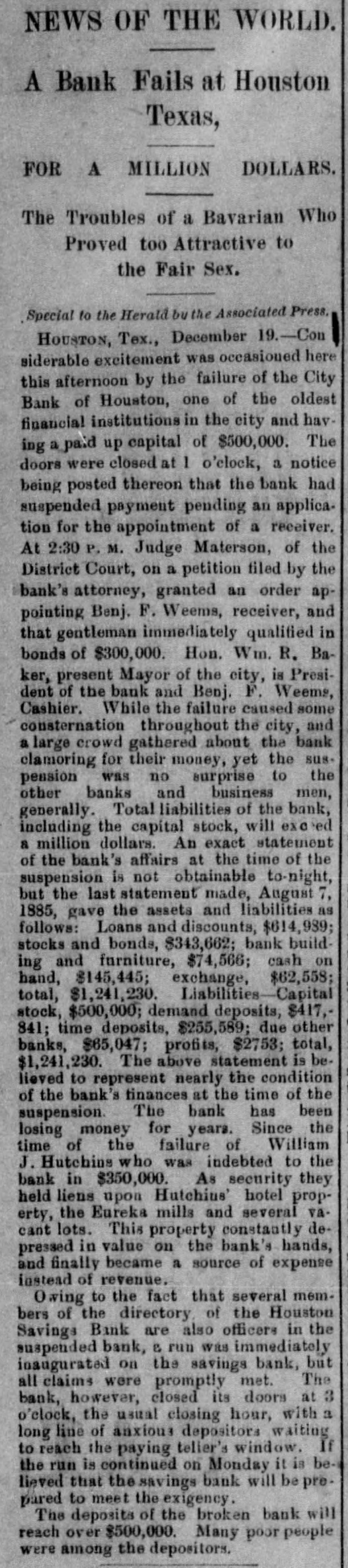 NEWS OF THE WORLD. A Bank Fails at Houston Texas, A MILLION DOLLARS. FOR The Troubles of a Bavarian Who Proved too Attractive to the Fair Sex. Special to the Herald by the Associated Press. HOUSTON, Tex., December 19.-Con siderable excitement was occasioned here this afternoon by the failure of the City Bank of Houston, one of the oldest financial institutions in the city and having a pa.d up capital of $500,000. The doors were closed at 1 o'clock, a notice being posted thereon that the bank had suspended payment pending an application for the appointment of a receiver. At 2:30 P. M. Judge Materson, of the District Court, on a petition filed by the bank's attorney, granted an order appointing Benj. F. Weems, receiver, and that gentleman immediately qualified in bonds of $300,000. Hon. Wm. R. Baker, present Mayor of the city, is President of the bank and Benj. F. Weems, Cashier. While the failure caused some consternation throughout the city, and a large crowd gathered about the bank clamoring for their money, yet the sus. was no surprise to the Total liabilities the a million dollars. other generally. pension including banks capital and An stock, exact business of will statement the exceed bank, men, of the bank's affairs at the time of the suspension is not obtainable to-night, but the last statement made, August 7 1885, gave the assets and liabilities as follows: Loans and discounts, $614,939; stocks and bonds, $343,662; bank building and furniture, $74,566; cash on hand, $145,445; exchange, $62,558; total, $1,241,230. Liabilities-Capital stock, $500,000; demand deposits, $417,841; time deposits, $255,589; due other banks, $65,047; profits, $2753; total, $1,241,230. The above statement is believed to represent nearly the condition of the bank's finances at the time of the suspension. The bank has been losing money for years. Since the time of the failure of William J. Hutchins who was indebted to the bank in $350,000. As security they held liens upon Hutchius' hotel property, the Eureka mills and several va. cant lots. This property constantly depressed in value on the bank's hands, and finally became a source of expense instead of revenue. Owing to the fact that several members of the directory of the Houston Savings Bank are also officers in the suspended bank, e run was immediately inaugurated on the savings bank, but all claims were promptly met. The bank, however, closed its doors at 3 o'clock, the usual closing hour, with a long line of anxious depositors waiting to reach the paying teller's window. If the run is continued on Monday it is believed that the savings bank will be prepared to meet the exigency. The deposits of the broken bank will reach over $500,000. Many poor people were among the depositors.