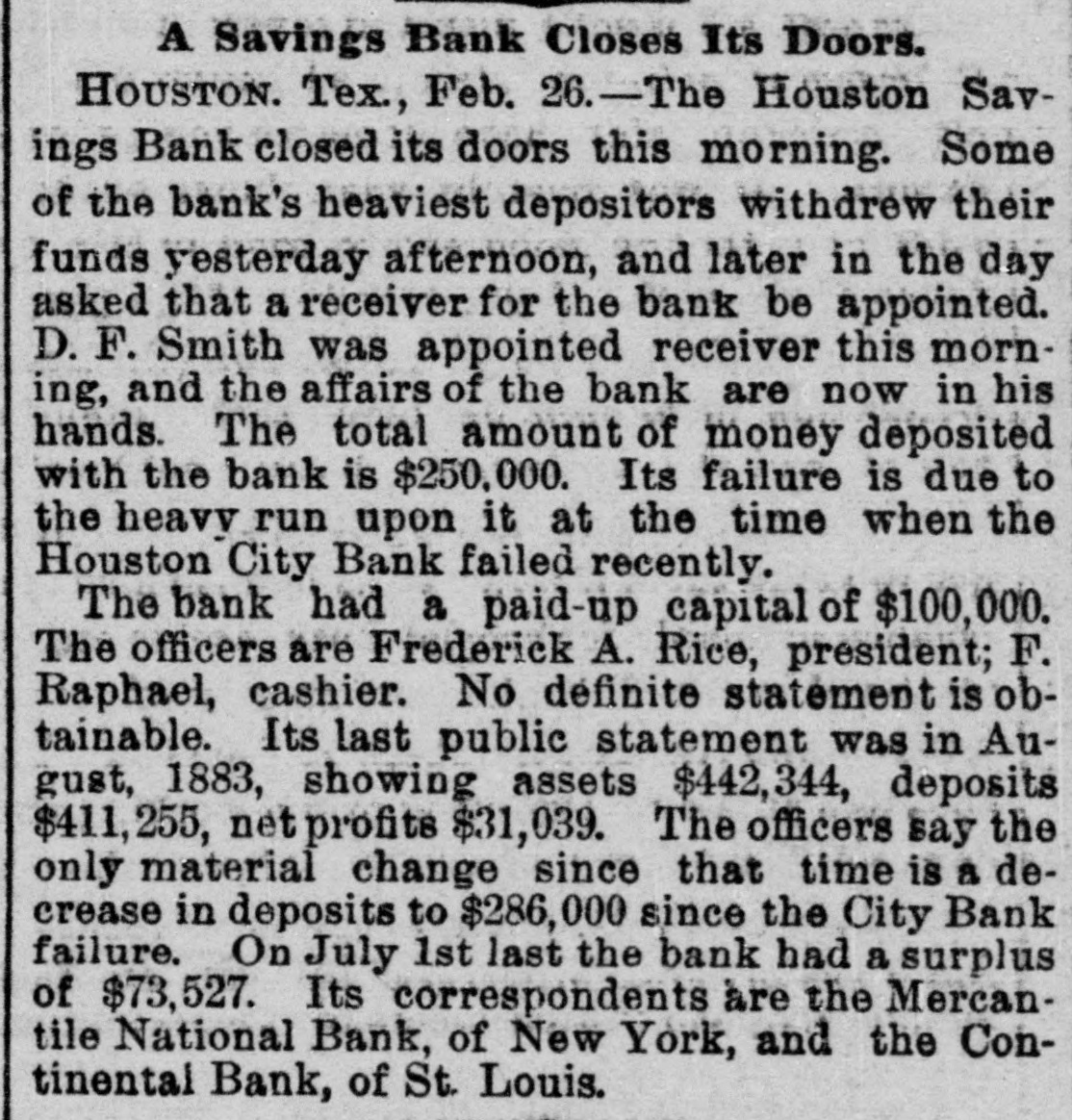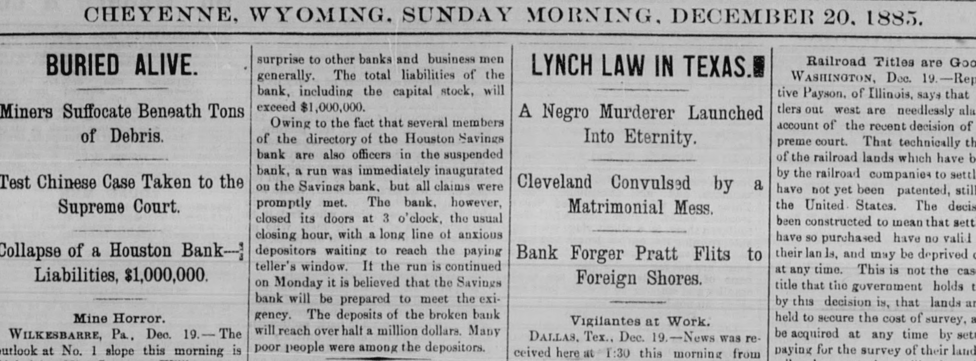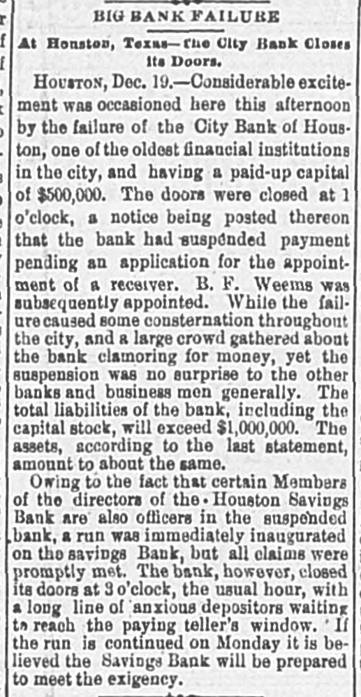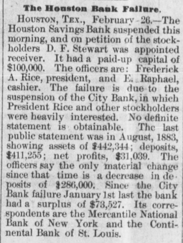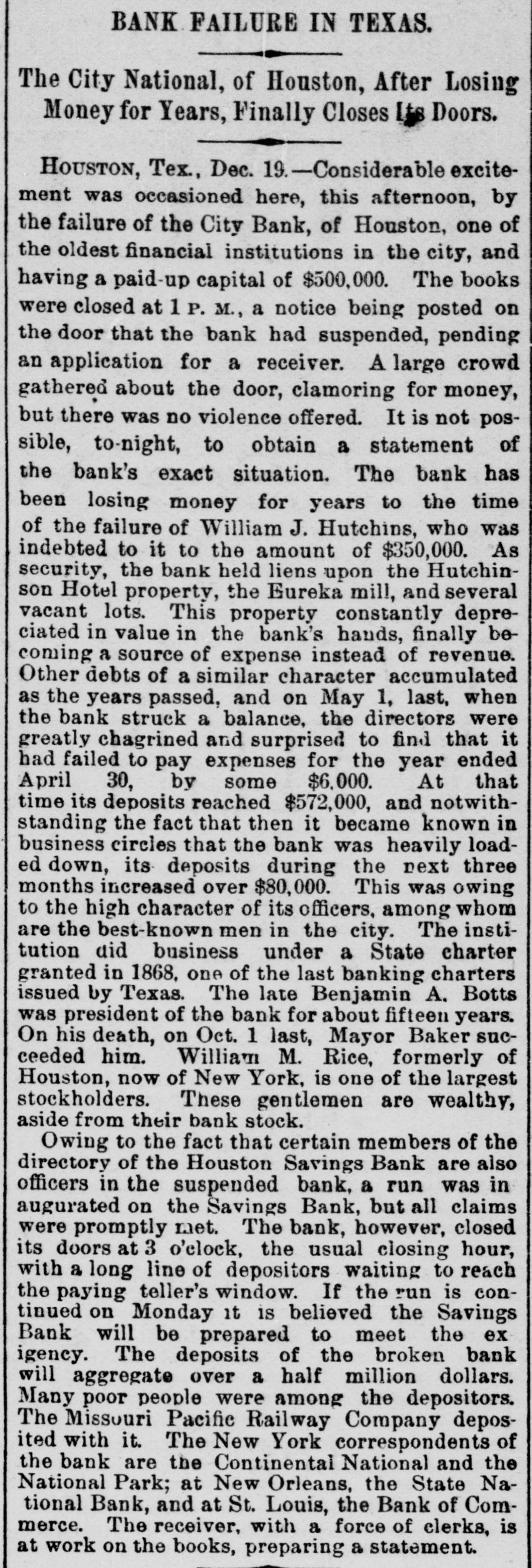 NEWS OF THE WORLD. A Bank Fails at Houston Texas, A MILLION DOLLARS. FOR The Troubles of a Bavarian Who Proved too Attractive to the Fair Sex. Special to the Herald by the Associated Press. HOUSTON, Tex., December 19.-Con siderable excitement was occasioned here this afternoon by the failure of the City Bank of Houston, one of the oldest financial institutions in the city and having a pa.d up capital of $500,000. The doors were closed at 1 o'clock, a notice being posted thereon that the bank had suspended payment pending an application for the appointment of a receiver. At 2:30 P. M. Judge Materson, of the District Court, on a petition filed by the bank's attorney, granted an order appointing Benj. F. Weems, receiver, and that gentleman immediately qualified in bonds of $300,000. Hon. Wm. R. Baker, present Mayor of the city, is President of the bank and Benj. F. Weems, Cashier. While the failure caused some consternation throughout the city, and a large crowd gathered about the bank clamoring for their money, yet the sus. was no surprise to the Total liabilities the a million dollars. other generally. pension including banks capital and An stock, exact business of will statement the exceed bank, men, of the bank's affairs at the time of the suspension is not obtainable to-night, but the last statement made, August 7 1885, gave the assets and liabilities as follows: Loans and discounts, $614,939; stocks and bonds, $343,662; bank building and furniture, $74,566; cash on hand, $145,445; exchange, $62,558; total, $1,241,230. Liabilities-Capital stock, $500,000; demand deposits, $417,841; time deposits, $255,589; due other banks, $65,047; profits, $2753; total, $1,241,230. The above statement is believed to represent nearly the condition of the bank's finances at the time of the suspension. The bank has been losing money for years. Since the time of the failure of William J. Hutchins who was indebted to the bank in $350,000. As security they held liens upon Hutchius' hotel property, the Eureka mills and several va. cant lots. This property constantly depressed in value on the bank's hands, and finally became a source of expense instead of revenue. Owing to the fact that several members of the directory of the Houston Savings Bank are also officers in the suspended bank, e run was immediately inaugurated on the savings bank, but all claims were promptly met. The bank, however, closed its doors at 3 o'clock, the usual closing hour, with a long line of anxious depositors waiting to reach the paying teller's window. If the run is continued on Monday it is believed that the savings bank will be prepared to meet the exigency. The deposits of the broken bank will reach over $500,000. Many poor people were among the depositors.