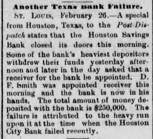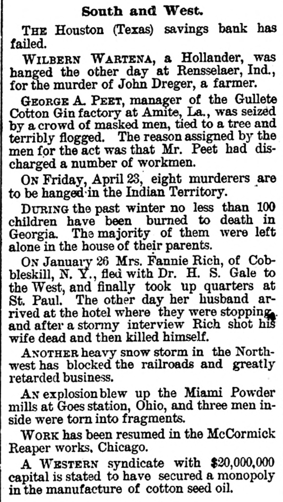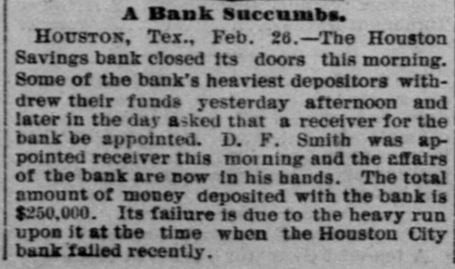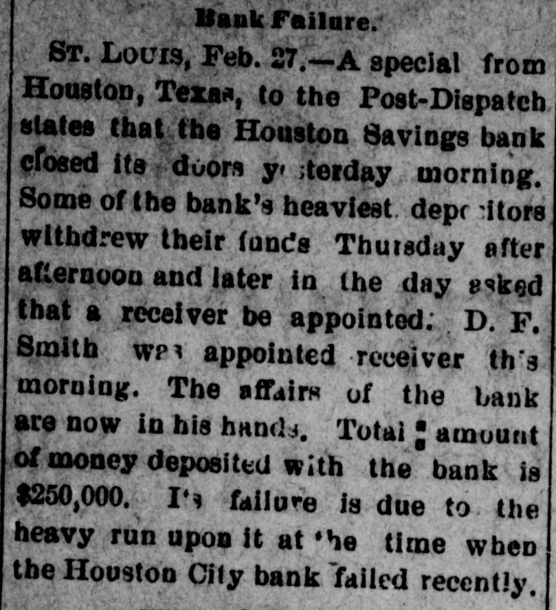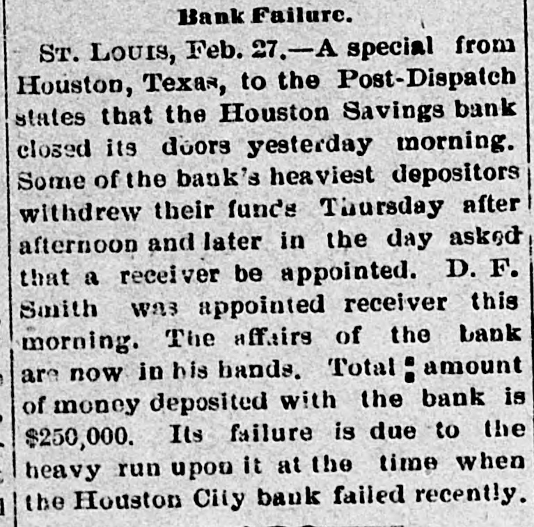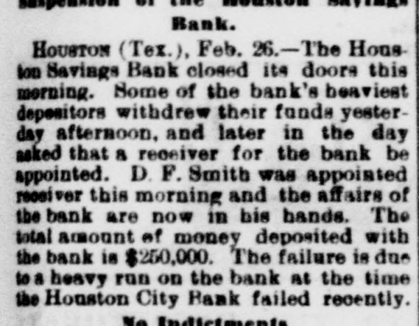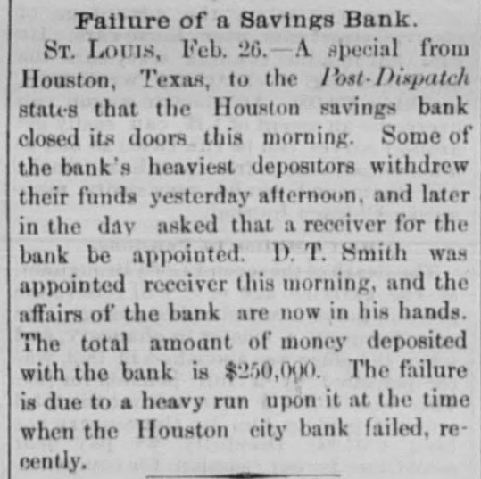 NEWS OF THE WORLD. A Bank Fails at Houston Texas, A MILLION DOLLARS. FOR The Troubles of a Bavarian Who Proved too Attractive to the Fair Sex. Special to the Herald by the Associated Press. HOUSTON, Tex., December 19.-Con siderable excitement was occasioned here this afternoon by the failure of the City Bank of Houston, one of the oldest financial institutions in the city and having a pa.d up capital of $500,000. The doors were closed at 1 o'clock, a notice being posted thereon that the bank had suspended payment pending an application for the appointment of a receiver. At 2:30 P. M. Judge Materson, of the District Court, on a petition filed by the bank's attorney, granted an order appointing Benj. F. Weems, receiver, and that gentleman immediately qualified in bonds of $300,000. Hon. Wm. R. Baker, present Mayor of the city, is President of the bank and Benj. F. Weems, Cashier. While the failure caused some consternation throughout the city, and a large crowd gathered about the bank clamoring for their money, yet the sus. was no surprise to the Total liabilities the a million dollars. other generally. pension including banks capital and An stock, exact business of will statement the exceed bank, men, of the bank's affairs at the time of the suspension is not obtainable to-night, but the last statement made, August 7 1885, gave the assets and liabilities as follows: Loans and discounts, $614,939; stocks and bonds, $343,662; bank building and furniture, $74,566; cash on hand, $145,445; exchange, $62,558; total, $1,241,230. Liabilities-Capital stock, $500,000; demand deposits, $417,841; time deposits, $255,589; due other banks, $65,047; profits, $2753; total, $1,241,230. The above statement is believed to represent nearly the condition of the bank's finances at the time of the suspension. The bank has been losing money for years. Since the time of the failure of William J. Hutchins who was indebted to the bank in $350,000. As security they held liens upon Hutchius' hotel property, the Eureka mills and several va. cant lots. This property constantly depressed in value on the bank's hands, and finally became a source of expense instead of revenue. Owing to the fact that several members of the directory of the Houston Savings Bank are also officers in the suspended bank, e run was immediately inaugurated on the savings bank, but all claims were promptly met. The bank, however, closed its doors at 3 o'clock, the usual closing hour, with a long line of anxious depositors waiting to reach the paying teller's window. If the run is continued on Monday it is believed that the savings bank will be prepared to meet the exigency. The deposits of the broken bank will reach over $500,000. Many poor people were among the depositors.