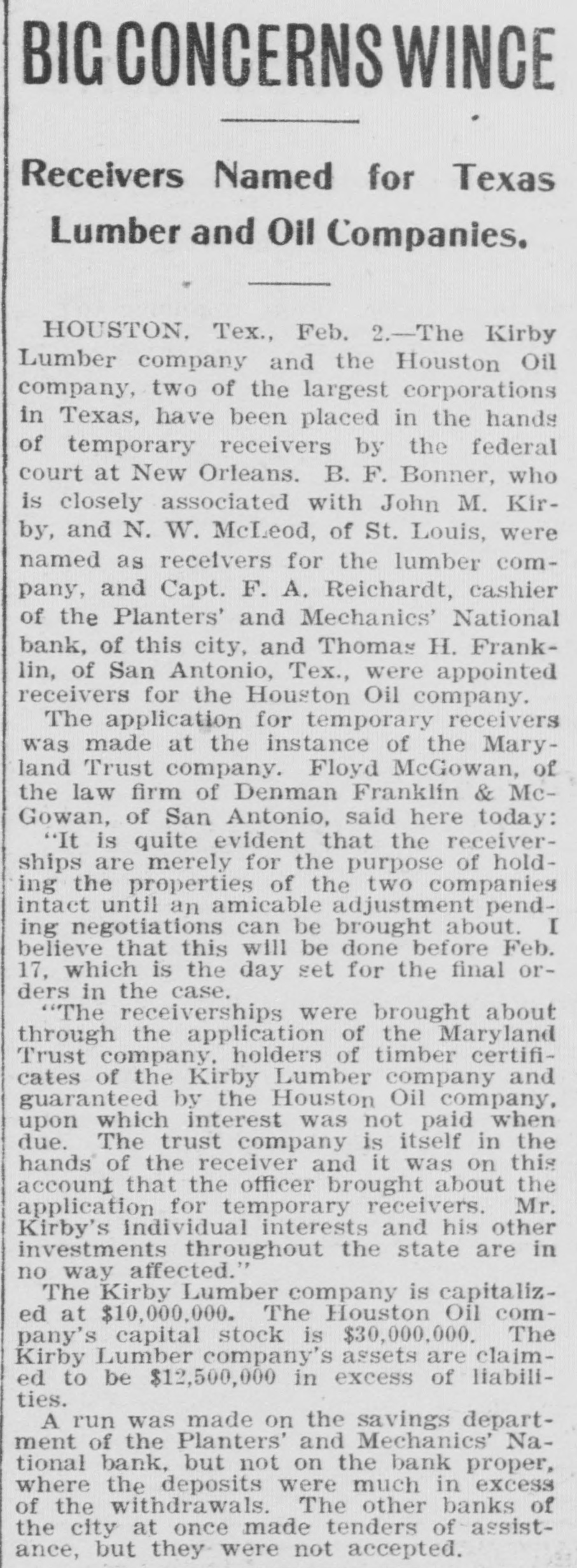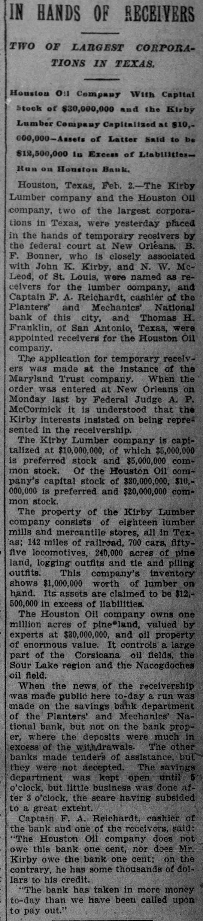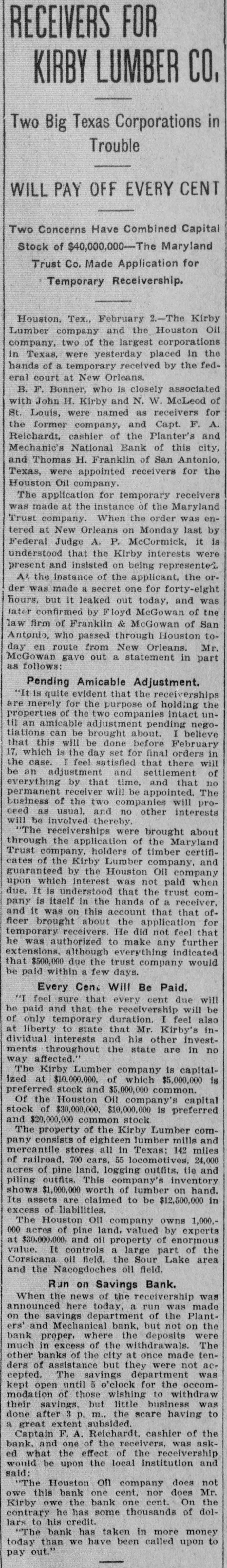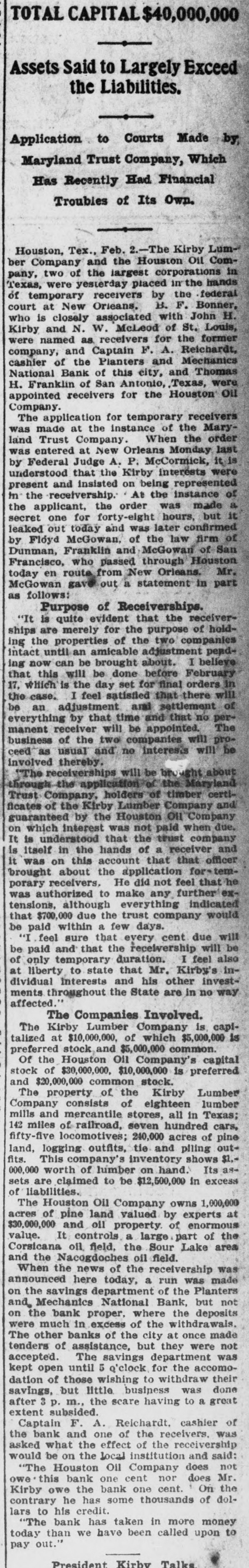 TOTAL CAPITAL $40,000,000 Assets Said to Largely Exceed the Liabilities. Application to Courts Made by Maryland Trust Company, Which Has Recently Had Financial Troubles of Its Own. Houston, Tex. Feb. 2.-The Kirby Lumber and the Houston Oil Comtwo of the largest in placed in Texas, pany, Company were yesterday corporations the the federal hands of receivers by B. associated H. court who temporary is at closely New Orieans, with of F. St. John Bonner, Louis, Kirby and N. W. McLeod were named as receivers for the former company, and Captain F. A. Reichardt, cashier of the Planters and Mechanics National Bank of this city, and Thomas H. Franklin of San Antonio, Texas, were appointed receivers for the Houston Oil Company. The application for temporary receivers was made at the instance of the Maryland Trust Company. When the order was entered at New Orleans Monday last by Federal Judge A. P. McCormick, it is understood that the Kirby interests were and insisted on being represented In At the the order was a present the applicant, receivership. the hours, instance made but of secret one for forty-eight it leaked out today and was later confirmed by Floyd McGowan, of the law firm of Dunman, Franklin and McGowan of San Francisco, who passed through Houston today en route from New Orleans. Mr. McGowan gave out a statement in part as follows: Purpose of Receiverships. "It is quite evident that the receiverships are merely for the purpose of holding the properties of the two companies intact until an amicable adjustment pending now can be brought about. I believe that this will be done before February 17, which is the day set for final orders in the case. I feel satisfied that there will be an adjustment and settlement of everything by that time and that no permanent receiver will be appointed. The business of the two companies will proceed as usual and no interests will be involved thereby, (The receiverships will be bro ght about through-the application the Maryland Trust Company, holders of timber certificates of the Kirby Lumber Company and guaranteed by the Houston OIL Company on which interest was not paid when due. It is understood that the trust company is itself in the hands of a receiver and it was on this account that that officer 'brought about the application for-temporary receivers, He did not feel that was authorized to make any further's tensions, although everything indicated that $700,000 due the trust company would be paid within a few days. "I feel sure that every cent due will be paid and that the receivership will be of only temporary duration. I feel also at liberty to state that Mr. Kirby's individual Interests and his other investments throughout the State are in no way affected. The Companies Involved. The Kirby Lumber Company is capitalized at $10,000,000, of which $5,000,000 is preferred stock and $5,000,000 common. Of the Houston Oil Company's capital stock of $30,000,000, $10,000,000 is preferred and $20,000,000 common stock. The property of the Kirby Lumber Company consists of eighteen lumber mills and mercantile stores, all in Texas; 142 miles of railroad, seven hundred cars, fifty-five locomotives; 240,000 acres of pine land, logging outfits, tie and piling outfits. This company's inventory shows $1.000,000 worth of lumber on hand. Its assets are claimed to be $12,500,000 in excess of liabilities. The Houston Oil Company owns 1,000,000 acres of pine land valued by experts at $30,000,000 and oil property of enormous value. It controls a large part of the Corsicana oil, field, the Sour Lake area and the Nacogdoches oil field. When the news of the receivership was announced here today, a run was made on the savings department of the Planters and Mechanics National Bank, but not on the bank proper, where the deposits were much in excess of the withdrawals The other banks of the city at once made tenders of assistance, but they were not accepted. The savings department was kept open until 5 Q'clock for the accomodation of those wishing to withdraw their savings, but little business was done after 3 p. m., the scare having to a great extent subsided. Captain F. A. Reichardt, cashier of the bank and one of the receivers. was asked what the effect of the receivership would be on the local institution and said: "The Houston Oil Company does not this bank one cent nor does Mr. the owe Kirby owe the bank one cent. On contrary he has some thousands of dollars to his credit. The bank has taken in more money today than we have been called upon to pay out. President Kirby Talks