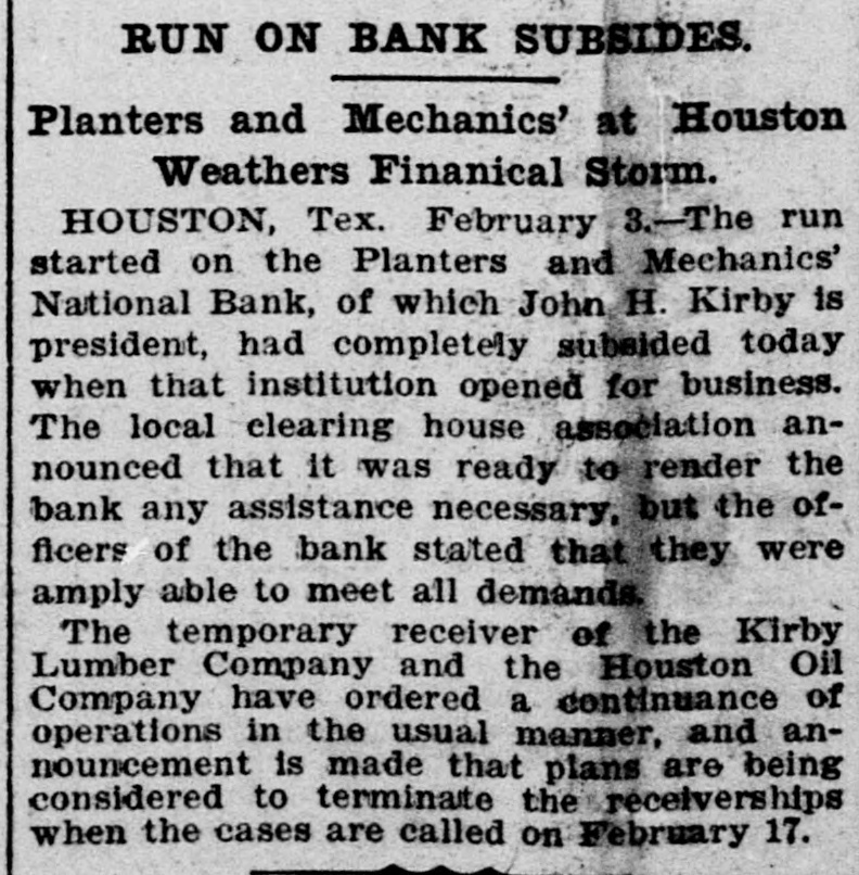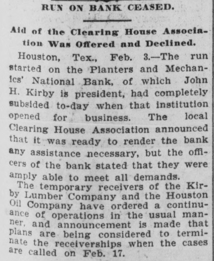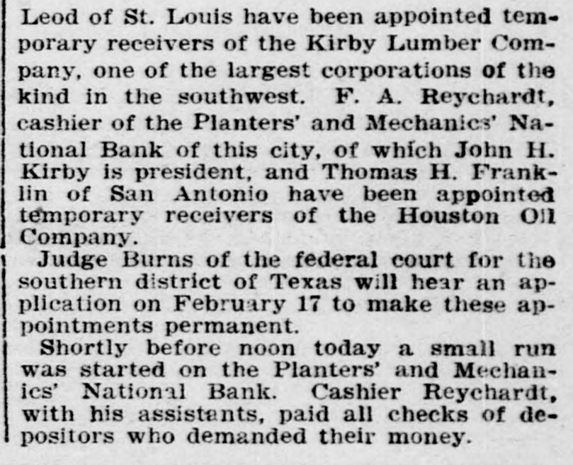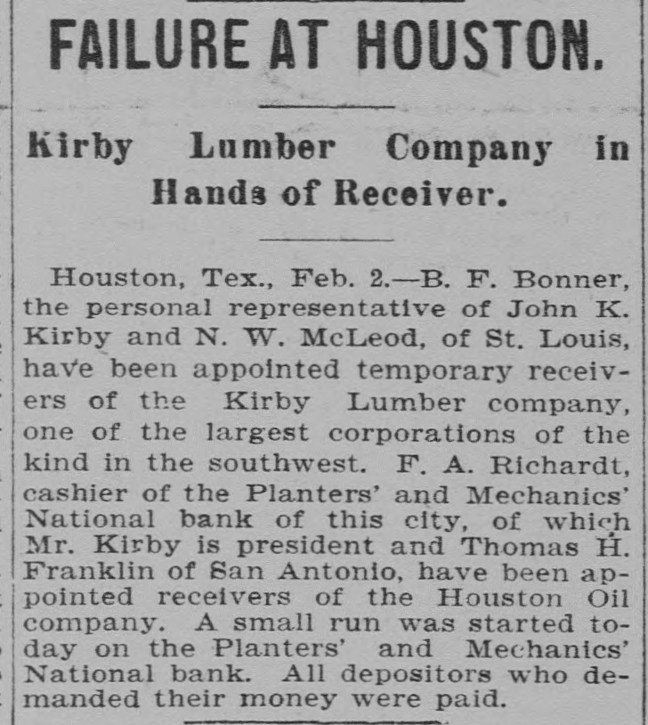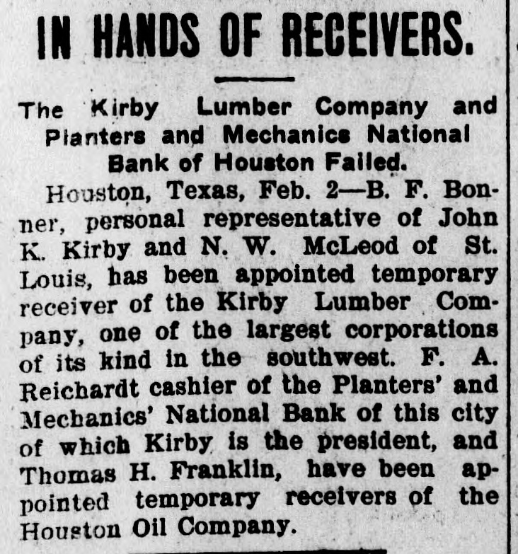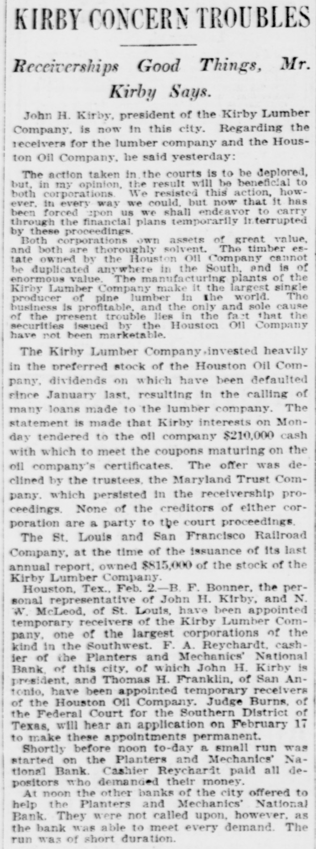 TOTAL CAPITAL $40,000,000 Assets Said to Largely Exceed the Liabilities. Application to Courts Made by Maryland Trust Company, Which Has Recently Had Financial Troubles of Its Own. Houston, Tex. Feb. 2.-The Kirby Lumber and the Houston Oil Comtwo of the largest in placed in Texas, pany, Company were yesterday corporations the the federal hands of receivers by B. associated H. court who temporary is at closely New Orieans, with of F. St. John Bonner, Louis, Kirby and N. W. McLeod were named as receivers for the former company, and Captain F. A. Reichardt, cashier of the Planters and Mechanics National Bank of this city, and Thomas H. Franklin of San Antonio, Texas, were appointed receivers for the Houston Oil Company. The application for temporary receivers was made at the instance of the Maryland Trust Company. When the order was entered at New Orleans Monday last by Federal Judge A. P. McCormick, it is understood that the Kirby interests were and insisted on being represented In At the the order was a present the applicant, receivership. the hours, instance made but of secret one for forty-eight it leaked out today and was later confirmed by Floyd McGowan, of the law firm of Dunman, Franklin and McGowan of San Francisco, who passed through Houston today en route from New Orleans. Mr. McGowan gave out a statement in part as follows: Purpose of Receiverships. "It is quite evident that the receiverships are merely for the purpose of holding the properties of the two companies intact until an amicable adjustment pending now can be brought about. I believe that this will be done before February 17, which is the day set for final orders in the case. I feel satisfied that there will be an adjustment and settlement of everything by that time and that no permanent receiver will be appointed. The business of the two companies will proceed as usual and no interests will be involved thereby, (The receiverships will be bro ght about through-the application the Maryland Trust Company, holders of timber certificates of the Kirby Lumber Company and guaranteed by the Houston OIL Company on which interest was not paid when due. It is understood that the trust company is itself in the hands of a receiver and it was on this account that that officer 'brought about the application for-temporary receivers, He did not feel that was authorized to make any further's tensions, although everything indicated that $700,000 due the trust company would be paid within a few days. "I feel sure that every cent due will be paid and that the receivership will be of only temporary duration. I feel also at liberty to state that Mr. Kirby's individual Interests and his other investments throughout the State are in no way affected. The Companies Involved. The Kirby Lumber Company is capitalized at $10,000,000, of which $5,000,000 is preferred stock and $5,000,000 common. Of the Houston Oil Company's capital stock of $30,000,000, $10,000,000 is preferred and $20,000,000 common stock. The property of the Kirby Lumber Company consists of eighteen lumber mills and mercantile stores, all in Texas; 142 miles of railroad, seven hundred cars, fifty-five locomotives; 240,000 acres of pine land, logging outfits, tie and piling outfits. This company's inventory shows $1.000,000 worth of lumber on hand. Its assets are claimed to be $12,500,000 in excess of liabilities. The Houston Oil Company owns 1,000,000 acres of pine land valued by experts at $30,000,000 and oil property of enormous value. It controls a large part of the Corsicana oil, field, the Sour Lake area and the Nacogdoches oil field. When the news of the receivership was announced here today, a run was made on the savings department of the Planters and Mechanics National Bank, but not on the bank proper, where the deposits were much in excess of the withdrawals The other banks of the city at once made tenders of assistance, but they were not accepted. The savings department was kept open until 5 Q'clock for the accomodation of those wishing to withdraw their savings, but little business was done after 3 p. m., the scare having to a great extent subsided. Captain F. A. Reichardt, cashier of the bank and one of the receivers. was asked what the effect of the receivership would be on the local institution and said: "The Houston Oil Company does not this bank one cent nor does Mr. the owe Kirby owe the bank one cent. On contrary he has some thousands of dollars to his credit. The bank has taken in more money today than we have been called upon to pay out. President Kirby Talks