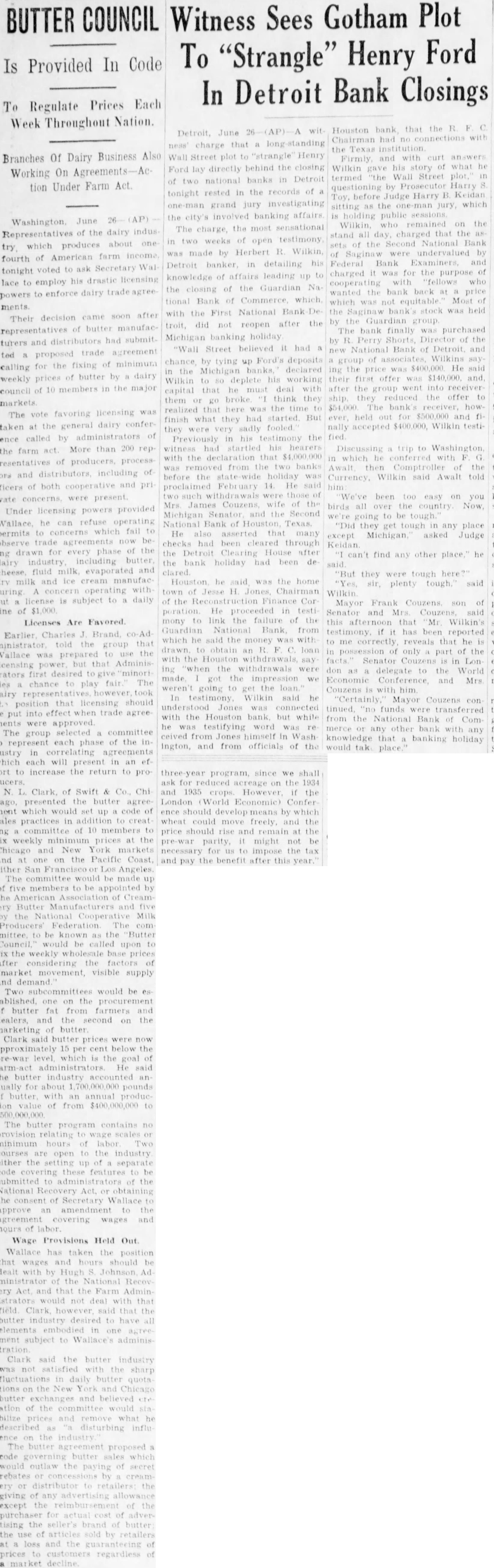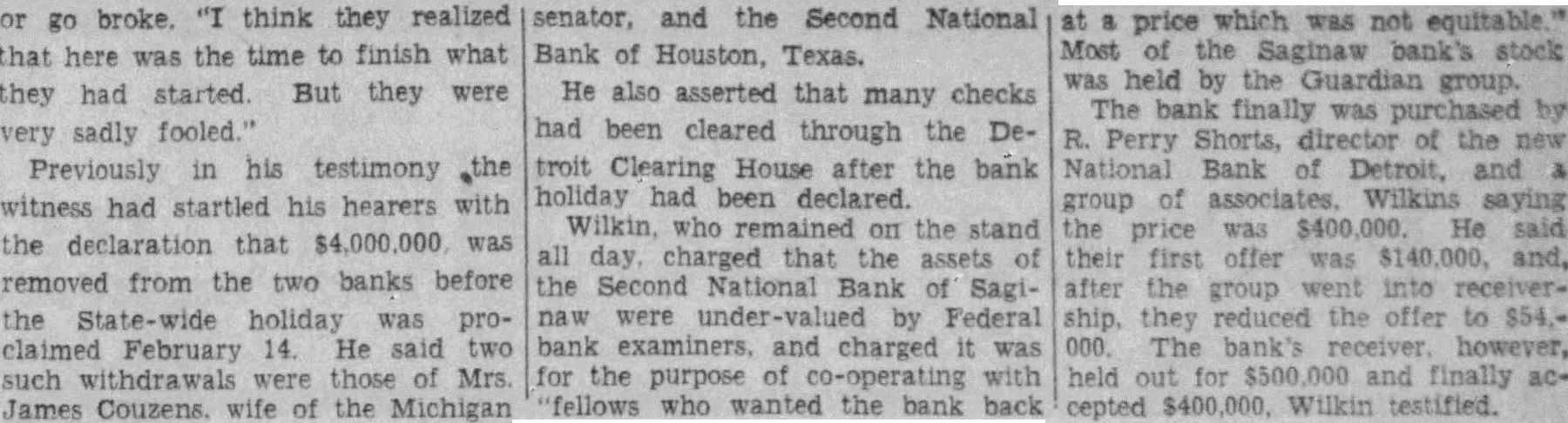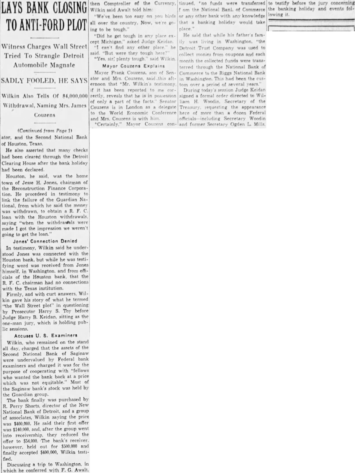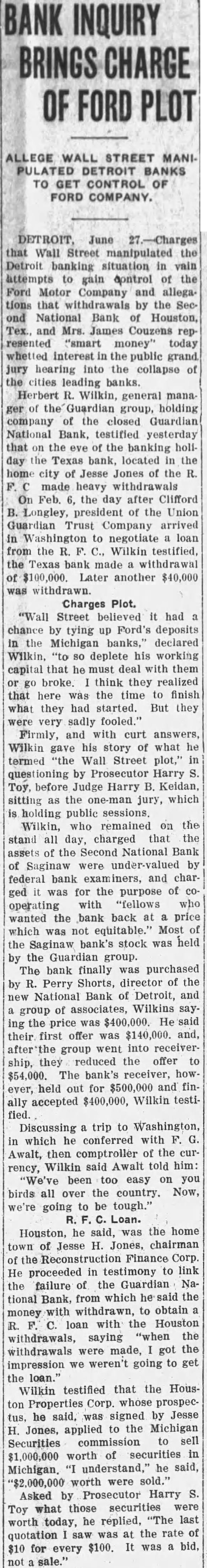 Charges Plot. Street believed had chance by tying up Ford's deposits the Michigan banks," declared Wilkin, so deplete his working capital that must deal with them broke. think they realized that here was the time to finish what they had started. But they very sadly fooled." Firmly, and with curt answers, Wilkin gave his story of what he termed Wall Street plot," in Prosecutor Harry Toy, before Judge Harry Keidan, sitting as the one-man jury, which holding public sessions, Wilkin, who remained on the stand all day, charged that the the Second National Bank assets of of Saginaw were under-valued federal bank examiners, and ged was for the purpose of with "fellows who operating wanted the bank back at price which was not equitable." Most of the Saginaw bank's stock was held by the Guardian group. The bank finally was purchased Shorts, director of the by Perry National Bank of Detroit, and of associates, Wilkins saygroup was $400,000. said ing the price their. offer and, went into receivergroup ship, they reduced offer $54,000. The bank's receiver, howheld out for $500,000 and fin$400,000, Wilkin testially accepted fied. Discussing trip to Washington, in which he conferred with Awalt, then comptroller of the Wilkin said Awalt told him: rency, been too easy on you birds all over the country. Now, we're going to be tough." Loan. Houston, he said, the home town of Jesse H. Jones, chairman the Reconstruction Finance Corp. in testimony to link He proceeded the failure the Guardian National Bank, from which the money with withdrawn, to obtain R. loan with the Houston saying "when the withdrawals, withdrawals made, got the impression we weren't going to get the loan." testified that the HousWilkin Properties Corp. whose prospeche said, signed by Jesse Jones, applied to the Michigan commission sell Securities $1,000,000 worth of securities in understand,' he said, Michigan. worth were sold." Asked by Prosecutor Harry what those securities were Toy he replied, last worth today, was at the rate of quotation $10 $100. It was bid, for every