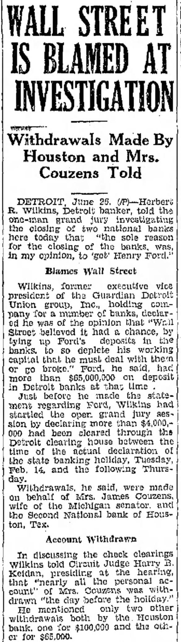 DETROIT, June Wall Street manipulated the Detroit banking situation in vain attempts to gain control of the Ford Motor Company and allegathat withdrawals by the ond National Bank of Houston, and Mrs. James Couzens represented "smart money" today interest the public grand jury hearing into the collapse of cities leading banks. Herbert Wilkin, general managroup, holding company of the closed Guardian National Bank, testified yesterday that the eve of the banking holiday the Texas bank, located in the home city of Jesse Jones of the R. made heavy withdrawals On Feb. the day after Clifford Longley, president of the Union Guardian Trust Company arrived Washington to negotiate loan from the Wilkin testified, the Texas bank made withdrawal Later another $40,000 withdrawn.