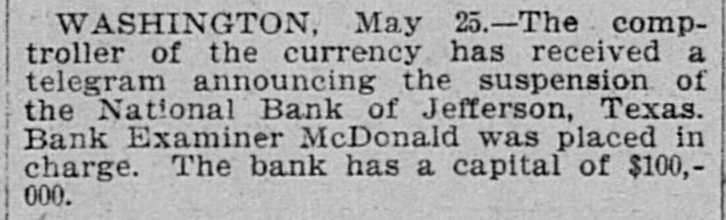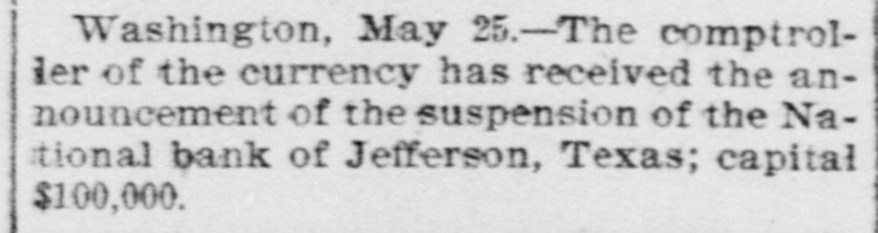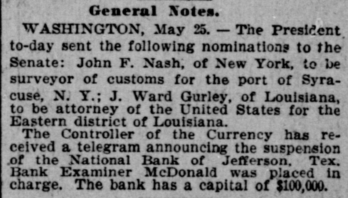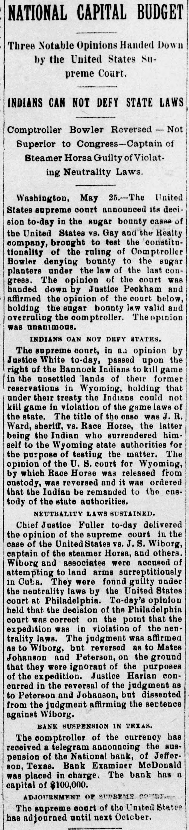 NATIONAL CAPITAL BUDGET Three Notable Opinions Handed Down by the United States Sui preme Court. INDIANS CAN NOT DEFY STATE LAWS Comptroller Bowler Reversed - Not Superior to Congress-Captain of Steamer Horsa Guilty of Violating Neutrality Laws. Washington, May 25.-The United States enpreme court announced its decision to-day in the augar bounty cases of the United States vs. Gay and the Realty company, brought to test the constitutionality of the ruling of Comptroller Bowler denying bounty to the sugar planters under the law of the last congress. The opinion of the court was handed down by Justice Peckham and affirmed the opinion of the court below, holding the sugar bounty law valid and overruling the comptroller. The opinion was unanimous. INDIANS CAN NOT DEFY STATES. The supreme court, in ad opinion by Justice White to-day, passed upon the right of the Bannock Indians to kill game in the unsettled lands of their former reservations in Wyoming, holding that under their treaty the Indians could not kill game in violation of the game laws of the state. The title of the case was J.R. Ward, sheriff, vs. Race Horse, the latter being the Indian who surrendered himself to the Wyoming state authorities for the purpose of testing the matter. The opinion of the U. S. court for Wyoming, by which Race Horse was released from custody, was reversed and it was ordered that the Indian be remanded to the custody of the state authorities. NEUTRALITY LAWS SUSTAINED. Chief Justice Fuller to-day delivered the opinion of the supreme court in the case of the United States vs. J.S. Wiborg, captain of the steamer Horsa, and others. Wiborg and associates were accused of attempting to land arms surreptitiously in Cuba. They were found guilty under the neutrality laws by the United States court at Philadelphia. To-day's opinion held that the decision of the Philadelphia court WAS correct on the point that the expedition was in violation of the nentrality laws. The judgment was affirmed as to Wiborg, but reversed as to Mates Johanson and Peterson, on the ground that they were ignorant of the purposes of the expedition. Justice Harlan concurred in the reversal of the judgment as to Peterson and Johanson, but dissented from the judgment affirming the sentence against Wiborg. BANK SUSPENSION IN TEXAS. The comptroller of the currency has received a telegram announcing the suspension of the National bank, of Jefferson, Texas. Bank Examiner McDonald was placed in charge. The bank has a capital of $100,000. ADJOUBNMENT OF SUPREME The supreme court of the United Statee has adjourned until next October.