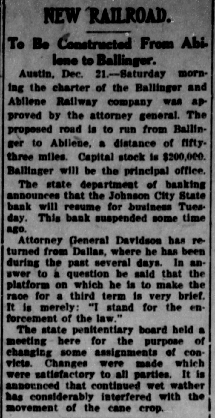 # TEXAS COTTON CROP. Commissioner Milner Says Figures Are Official. Austin, Nov. 23.-Commissioner of Agriculture Milner gave out his estimate of cotton crop of Texas for 1907 which he places at 1,987,887 bales. This is based on the fact that 86 percent of the present cotton crop in Texas as has been ginned. He compares the percentage of cotton crops which have been ginned up to Nov. 14 for the past four years in order to reach the conclusion of his present estimate. These percentages and figures, Commissioner Milner says, are official, as they are figures given of ginners' reports by the Federal government. An important conference of officers of the Texas National guard was held here in the adjutant general's department for the purpose of taking definite steps toward reducing the Texas National guard from a division to a brigade. The question of a successor to Major General William H. Stacy, as commander of the guard was also discussed. Plans for the next encampment were also debated. The following officers attended: Generals Newton, Stacy, Hulen and Scurry; Colonels Hutchings, Townsend, Lyon, Brynes and Delamater. A statement was given out by the department of agriculture showing the total number of bales of cotton ginned of this season's crop up to Nov. 1, which is 1,137,010 square and 52,550 round bales. State Bank Superintendant Love has announced the appointment of Thomas Shearon of Dallas to be special agent of and take charge of the Johnson City State bank, which suspended several days ago. Mr. Love is just back from San Antonio in connection with the West Texas Bank and Trust company. He says that the institution will be able to resume business within a short time.