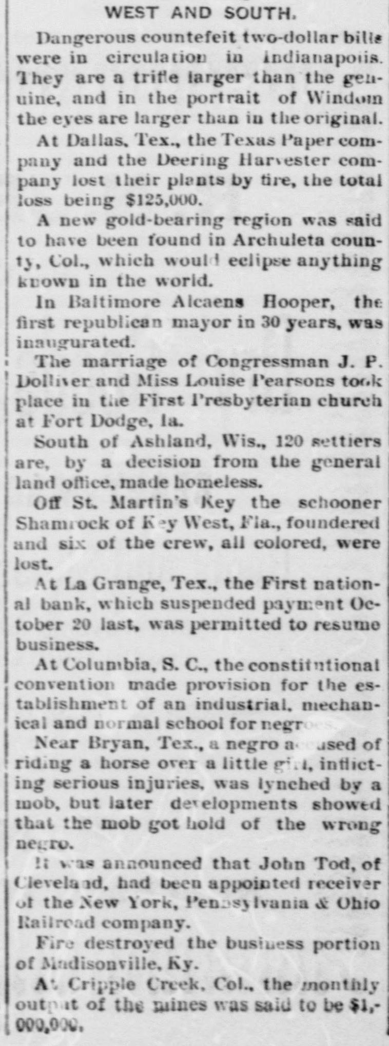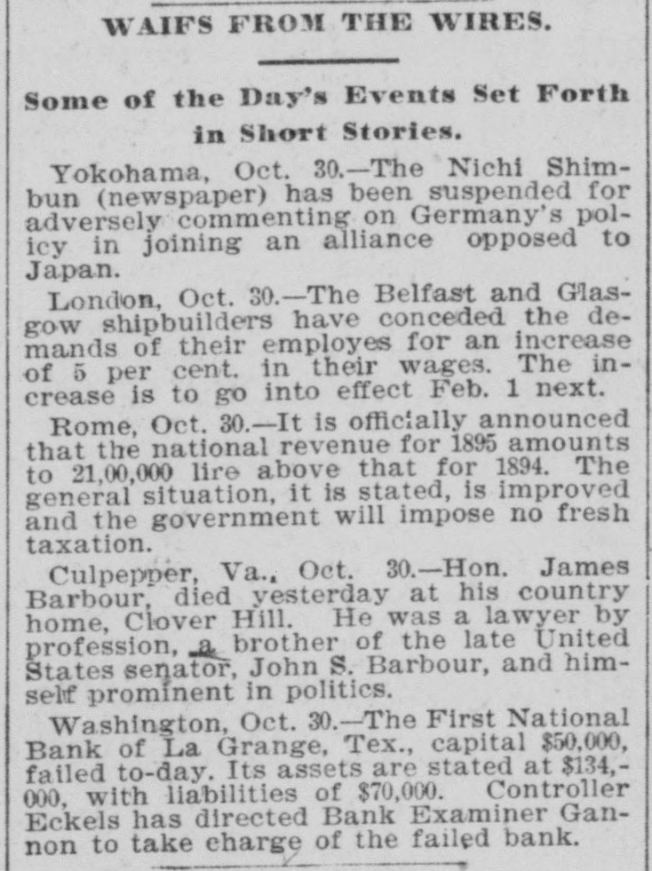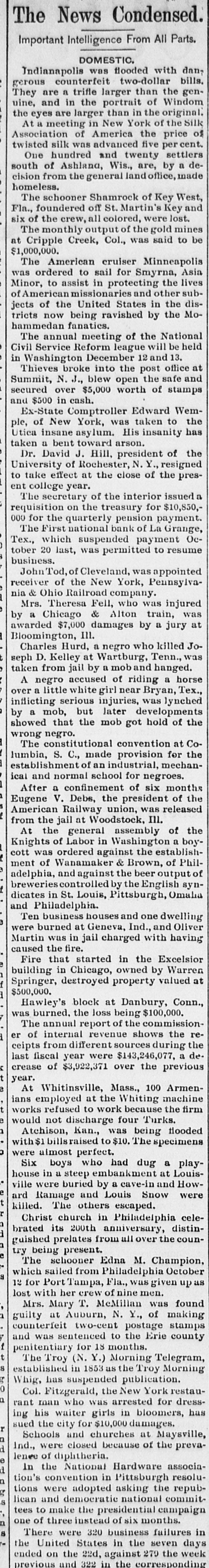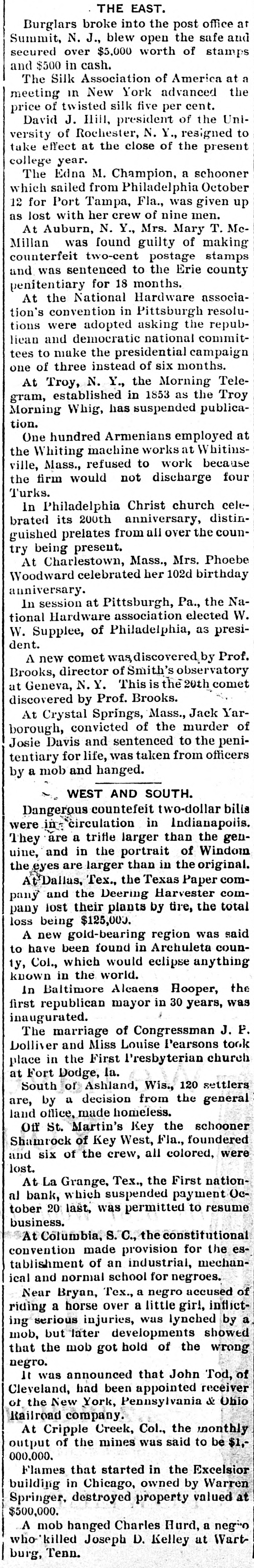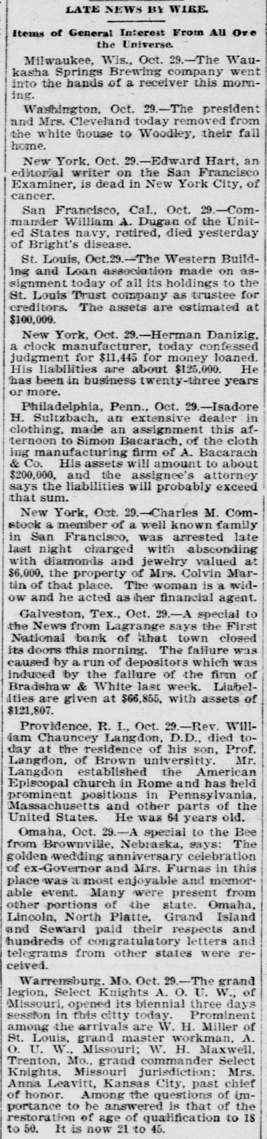LATE NEWS BY WIRE. Items of General Interest From All Ove the Universe. Milwaukee, Wis., Oct. 29.-The Waukasha Springs Brewing company went into the hands of a receiver this morning. Washington, Oct. 29.-The president and Mrs. Cleveland today removed from the white house to Woodley, their fall home. New York, Oct. 29.-Edward Hart, an editorial writer on the San Francisco Examiner, is dead in New York City, of cancer. San Francisco, Cal., Oct. 29.-Commander William A. Dugan of the United States navy, retired, died yesterday of Bright's disease. St. Louis, Oct.29.-The Western Building and Loan association made on assignment today of all its holdings to the St. Louis Trust company as trustee for creditors. The assets are estimated at $100,000. New York, Oct. 29.-Herman Danizig, a clock manufacturer, today confessed judgment for $11,445 for money loaned. His liabilities are about $125,000. He has been in business twenty-three years or more. Philadelphia, Penn., Oct. 29.-Isadore H. Sultzbach, an extensive dealer in clothing, made an assignment this afternoon to Simon Bacarach, of the cloth ing manufacturing firm of A. Bacarach & Co. His assets will amount to about $200,000, and the assignee's attorney says the liabilities will probably exceed that sum. New York, Oct. 29.-Charles M. Comstock a member of a well known family in San Francisco, was arrested late last night charged with absconding with diamonds and jewehry valued at $6,000, the property of Mrs. Colvin Martin of that place. The woman is a widow and he acted as ther financial agent. Galveston, Tex., Oct. 29.-A special to the News from Lagrange says the First National bank of that town closed its doors this morning. The failure was caused by a run of depositors which was induced by the failure of the firm of Bradshaw & White last week. Liabelities are given at $66,855, with assets of $121,807. Providence, R. I., Oct. 29.-Rev. William Chauncey Langdon, D.D., died today at the residence of his son, Prof. Langdon, of Brown universitty. Mr. Langdon established the American Episcopal church in Rome and has held prominent positions in Pennsylvania, Massachusetts and other parts of the United States. He was 64 years old. Omaha, Oct. 29.-A special to the Bee from Brownville, Nebraska, says: The golden wedding anniversary celebration of ex-Governor and Mrs. Furnas in this place was armost enjoyable and memorable event. Many were present from other portions of the state. Omaha, Lincoln, North Platte, Grand Island and Seward paid their respects and hundreds of congratulatory letters and telegrams from other states were received. Warrensburg, Mo. Oct. 29.-The grand legion, Select Knights A. O. U. W., of Missouri, opened its biennial three days session in this citty today. Prominent among the arrivals are W. H. Miller of St. Louis, grand master workman, A. O. U. W., Missouri; W. H. Maxwell. Trenton, Mo., grand commander Select Knights, Missouri jurisdiction: Mrs. Anna Leavitt, Kansas City, past chief of honor. Among the questions of importance to be answered is that of the restoration of age of qualification to 18 to 50. It is now 21 to 45.