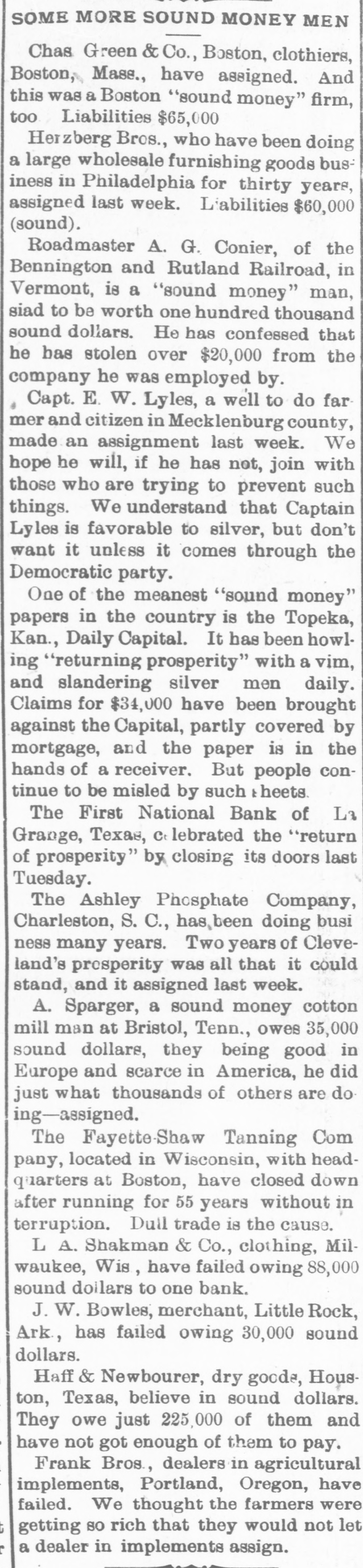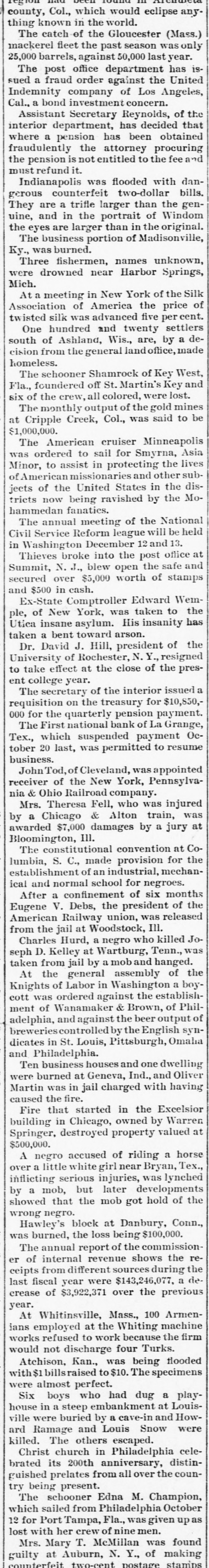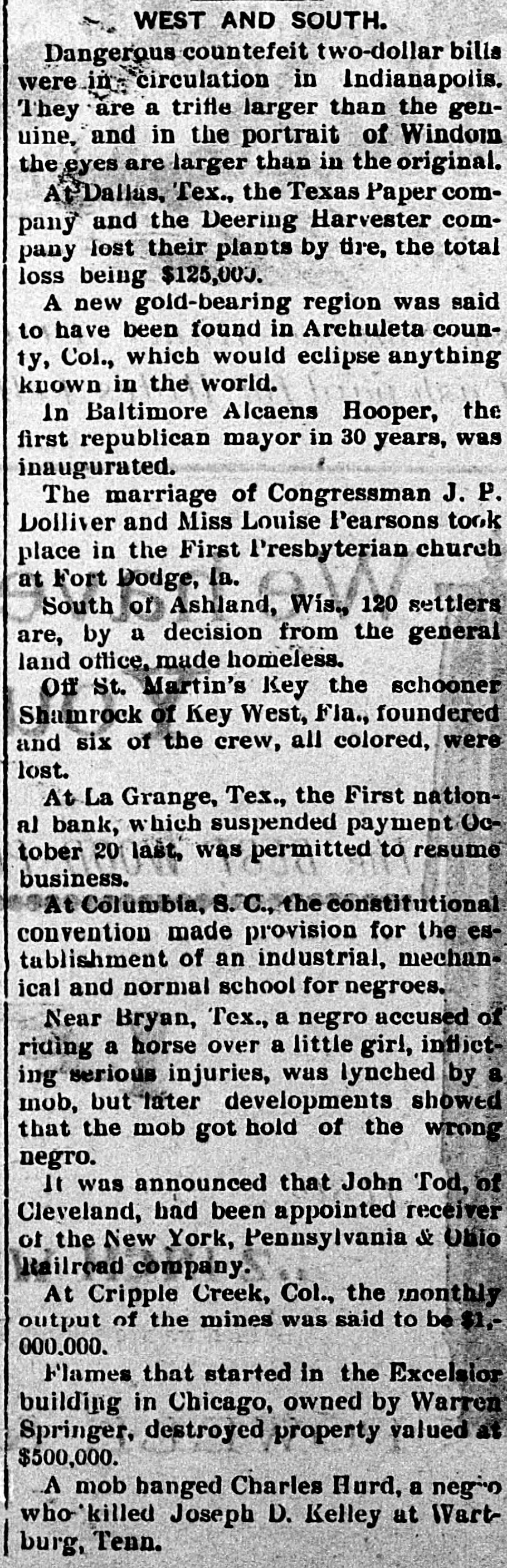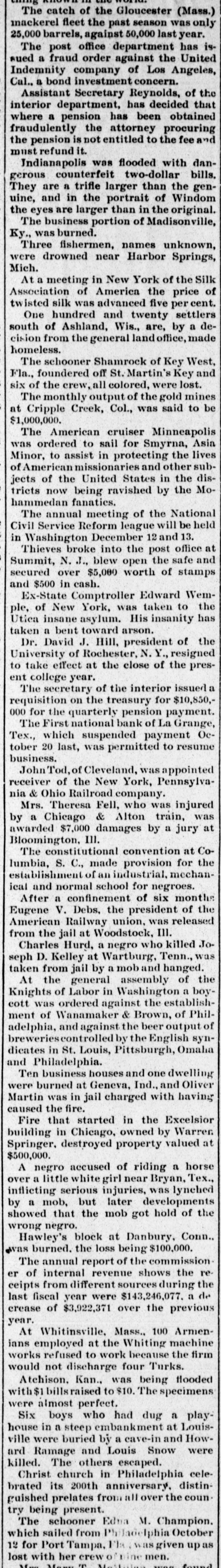 LATE NEWS BY WIRE. Items of General Interest From All Ove the Universe. Milwaukee, Wis., Oct. 29.-The Waukasha Springs Brewing company went into the hands of a receiver this morning. Washington, Oct. 29.-The president and Mrs. Cleveland today removed from the white house to Woodley, their fall home. New York, Oct. 29.-Edward Hart, an editorial writer on the San Francisco Examiner, is dead in New York City, of cancer. San Francisco, Cal., Oct. 29.-Commander William A. Dugan of the United States navy, retired, died yesterday of Bright's disease. St. Louis, Oct.29.-The Western Building and Loan association made on assignment today of all its holdings to the St. Louis Trust company as trustee for creditors. The assets are estimated at $100,000. New York, Oct. 29.-Herman Danizig, a clock manufacturer, today confessed judgment for $11,445 for money loaned. His liabilities are about $125,000. He has been in business twenty-three years or more. Philadelphia, Penn., Oct. 29.-Isadore H. Sultzbach, an extensive dealer in clothing, made an assignment this afternoon to Simon Bacarach, of the cloth ing manufacturing firm of A. Bacarach & Co. His assets will amount to about $200,000, and the assignee's attorney says the liabilities will probably exceed that sum. New York, Oct. 29.-Charles M. Comstock a member of a well known family in San Francisco, was arrested late last night charged with absconding with diamonds and jewehry valued at $6,000, the property of Mrs. Colvin Martin of that place. The woman is a widow and he acted as ther financial agent. Galveston, Tex., Oct. 29.-A special to the News from Lagrange says the First National bank of that town closed its doors this morning. The failure was caused by a run of depositors which was induced by the failure of the firm of Bradshaw & White last week. Liabelities are given at $66,855, with assets of $121,807. Providence, R. I., Oct. 29.-Rev. William Chauncey Langdon, D.D., died today at the residence of his son, Prof. Langdon, of Brown universitty. Mr. Langdon established the American Episcopal church in Rome and has held prominent positions in Pennsylvania, Massachusetts and other parts of the United States. He was 64 years old. Omaha, Oct. 29.-A special to the Bee from Brownville, Nebraska, says: The golden wedding anniversary celebration of ex-Governor and Mrs. Furnas in this place was armost enjoyable and memorable event. Many were present from other portions of the state. Omaha, Lincoln, North Platte, Grand Island and Seward paid their respects and hundreds of congratulatory letters and telegrams from other states were received. Warrensburg, Mo. Oct. 29.-The grand legion, Select Knights A. O. U. W., of Missouri, opened its biennial three days session in this citty today. Prominent among the arrivals are W. H. Miller of St. Louis, grand master workman, A. O. U. W., Missouri; W. H. Maxwell. Trenton, Mo., grand commander Select Knights, Missouri jurisdiction: Mrs. Anna Leavitt, Kansas City, past chief of honor. Among the questions of importance to be answered is that of the restoration of age of qualification to 18 to 50. It is now 21 to 45.