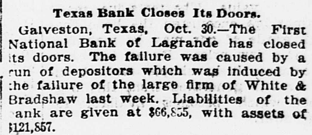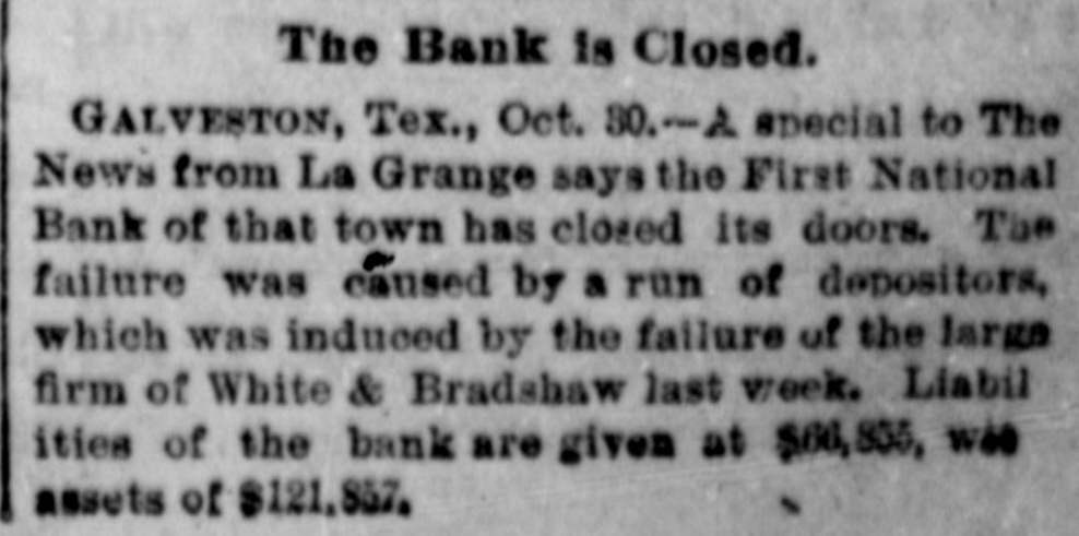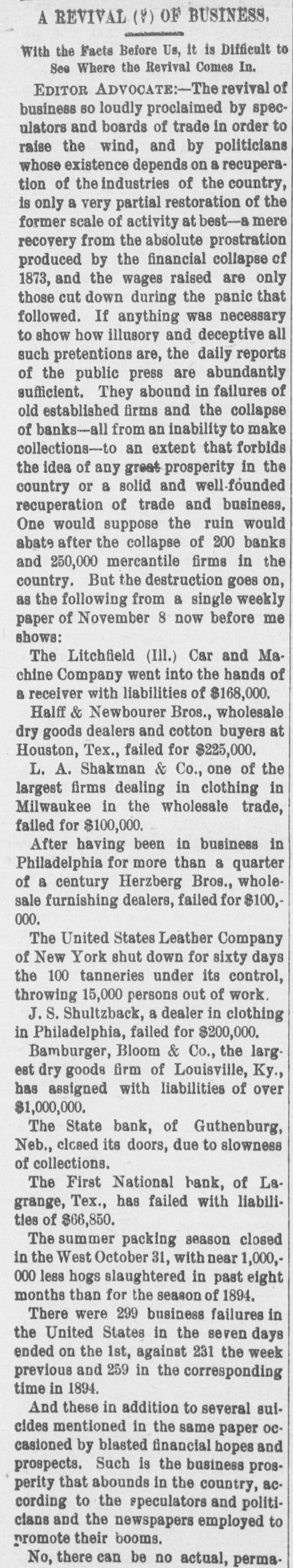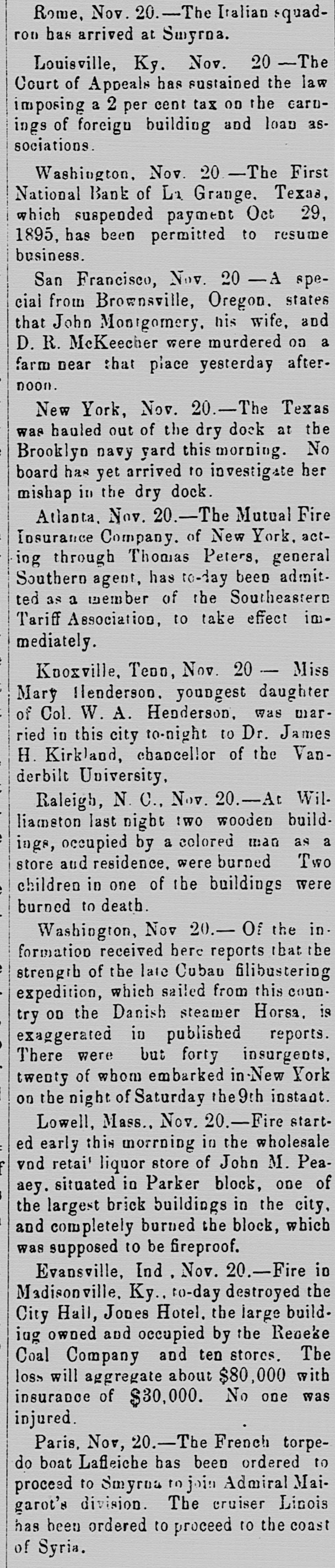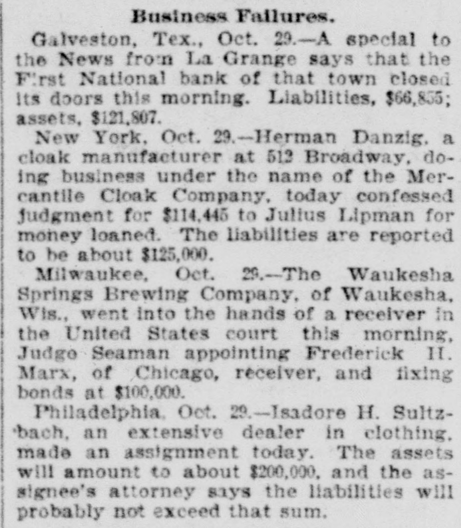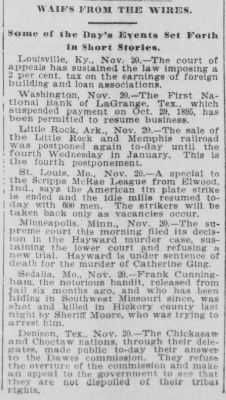 LATE NEWS BY WIRE. Items of General Interest From All Ove the Universe. Milwaukee, Wis., Oct. 29.-The Waukasha Springs Brewing company went into the hands of a receiver this morning. Washington, Oct. 29.-The president and Mrs. Cleveland today removed from the white house to Woodley, their fall home. New York, Oct. 29.-Edward Hart, an editorial writer on the San Francisco Examiner, is dead in New York City, of cancer. San Francisco, Cal., Oct. 29.-Commander William A. Dugan of the United States navy, retired, died yesterday of Bright's disease. St. Louis, Oct.29.-The Western Building and Loan association made on assignment today of all its holdings to the St. Louis Trust company as trustee for creditors. The assets are estimated at $100,000. New York, Oct. 29.-Herman Danizig, a clock manufacturer, today confessed judgment for $11,445 for money loaned. His liabilities are about $125,000. He has been in business twenty-three years or more. Philadelphia, Penn., Oct. 29.-Isadore H. Sultzbach, an extensive dealer in clothing, made an assignment this afternoon to Simon Bacarach, of the cloth ing manufacturing firm of A. Bacarach & Co. His assets will amount to about $200,000, and the assignee's attorney says the liabilities will probably exceed that sum. New York, Oct. 29.-Charles M. Comstock a member of a well known family in San Francisco, was arrested late last night charged with absconding with diamonds and jewehry valued at $6,000, the property of Mrs. Colvin Martin of that place. The woman is a widow and he acted as ther financial agent. Galveston, Tex., Oct. 29.-A special to the News from Lagrange says the First National bank of that town closed its doors this morning. The failure was caused by a run of depositors which was induced by the failure of the firm of Bradshaw & White last week. Liabelities are given at $66,855, with assets of $121,807. Providence, R. I., Oct. 29.-Rev. William Chauncey Langdon, D.D., died today at the residence of his son, Prof. Langdon, of Brown universitty. Mr. Langdon established the American Episcopal church in Rome and has held prominent positions in Pennsylvania, Massachusetts and other parts of the United States. He was 64 years old. Omaha, Oct. 29.-A special to the Bee from Brownville, Nebraska, says: The golden wedding anniversary celebration of ex-Governor and Mrs. Furnas in this place was armost enjoyable and memorable event. Many were present from other portions of the state. Omaha, Lincoln, North Platte, Grand Island and Seward paid their respects and hundreds of congratulatory letters and telegrams from other states were received. Warrensburg, Mo. Oct. 29.-The grand legion, Select Knights A. O. U. W., of Missouri, opened its biennial three days session in this citty today. Prominent among the arrivals are W. H. Miller of St. Louis, grand master workman, A. O. U. W., Missouri; W. H. Maxwell. Trenton, Mo., grand commander Select Knights, Missouri jurisdiction: Mrs. Anna Leavitt, Kansas City, past chief of honor. Among the questions of importance to be answered is that of the restoration of age of qualification to 18 to 50. It is now 21 to 45.