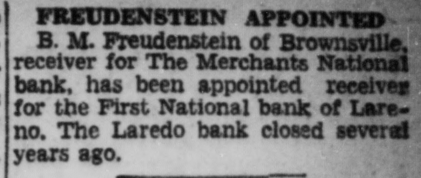 FREUDENSTEIN APPOINTED B. M. Freudenstein of Brownsville, receiver for The Merchants National bank, has been appointed receiver for the First National bank of Lareno. The Laredo bank closed several years ago.