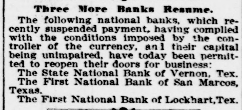 Three More Banks Resume. The following national banks, which recently suspended payment, having complied with the conditions imposed by the controller of the currency, and their capital being unimpaired, have today been permitted to reopen their doors for business: The State National Bank of Vernon, Tex. The First National Bank of San Marcos, Texas. The First National Bank of Lockhart, Tex.