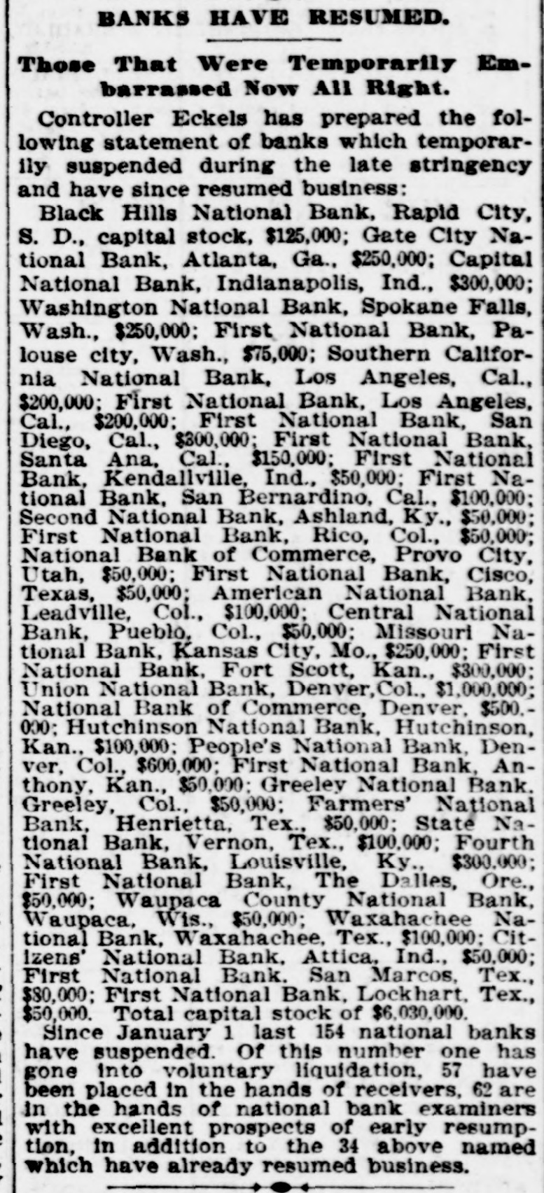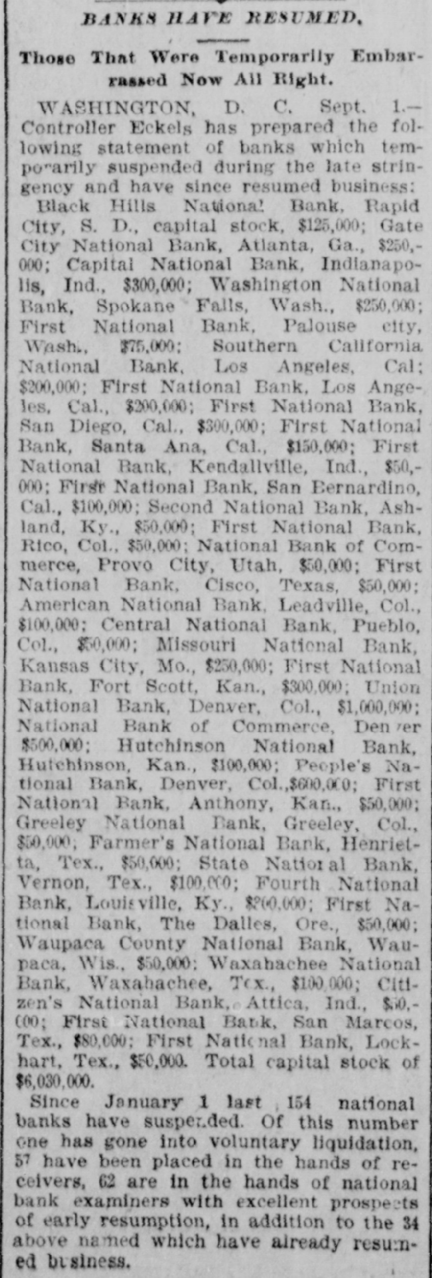 BANKS HAVE RESUMED. Those That Were Temporarily Embarrassed Now All Right. WASHINGTON, D. C. Sept. 1.Controller Eckels has prepared the following statement of banks which temporarily suspended during the late stringency and have since resumed business: Black Hills National Bank, Rapid City, S. D., capital stock, $125,000; Gate City National Bank, Atlanta, Ga., $250,000; Capital National Bank, Indianapolis, Ind., $300,000; Washington National Bank, Spokane Falls, Wash., $250,000; First National Bank, Palouse city, Wash., $75,000: Southern California National Bank, Los Angeles, Cal: $200,000; First National Bank, Los Angeles, Cal., $200,000; First National Bank, San Diego, Cal., $300,000; First National Bank, Santa Ana, Cal., $150,000; First National Bank, Kendallville, Ind., $50,000; First National Bank, San Bernardino, Cal., $100,000; Second National Bank, Ashland, Ky., $50,000; First National Bank, Rico, Col., $50,000; National Bank of Commerce, Provo City, Utah, $50,000; First National Bank, Cisco, Texas, $50,000; American National Bank, Leadville, Col., $100,000; Central National Bank, Pueblo, Col., $50,000; Missouri National Bank, Kansas City, Mo., $250,000; First National Bank, Fort Scott, Kan., $300,000; Union National Bank, Denver, Col., $1,000,000; National Bank of Commerce, Den ver $500,000; Hutchinson National Bank, Hutchinson, Kan., $100,000; People's National Bank, Denver, Col.,$600,000; First National Bank, Anthony, Kan., $50,000; Greeley National Bank, Greeley, Col., $50,000; Farmer's National Bank, Henrietta, Tex., $50,000; State National Bank, Vernon, Tex., $100,000; Fourth National Bank, Louisville, Ky., $200,000; First National Bank, The Dalles, Ore., $50,000; Waupaca County National Bank, Waupaca, Wis., $50,000: Waxabachee National Bank, Waxabachee, Tex., $100,000; Citizen's National Bank, Attica, Ind., $50,000; First National Bank, San Marcos, Tex., $80,000; First National Bank, Lockhart, Tex., $50,000. Total capital stock of $6,030,000. Since January 1 last 154 national banks have suspended. Of this number one has gone into voluntary liquidation, 57 have been placed in the hands of receivers, 62 are in the hands of national bank examiners with excellent prospects of early resumption, in addition to the 34 above named which have already resumed business.