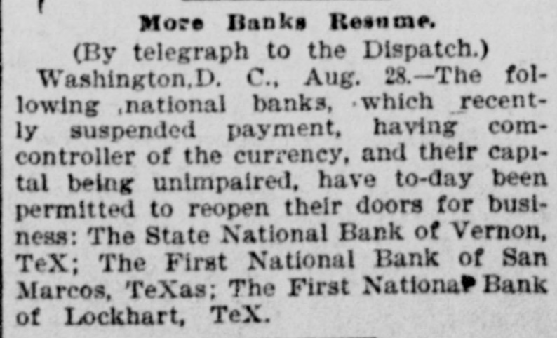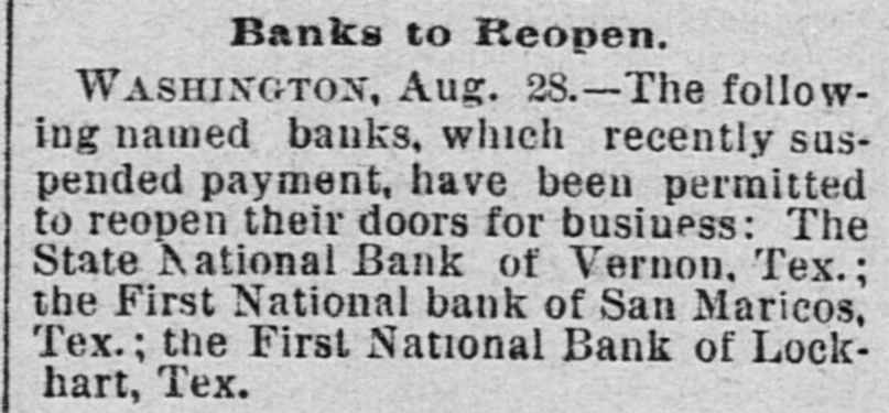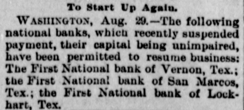 Articles (Aug 28–29, 1893) list the First National Bank of Lockhart, Tex., among national banks that recently suspended payment and were permitted to reopen on Aug 28, 1893 after complying with conditions imposed by the Controller of the Currency. No run on this specific bank is mentioned; suspension occurred during the general 1893 stringency (systemic).