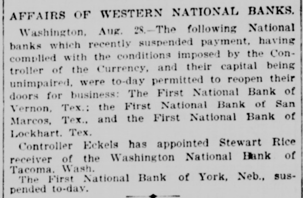 AFFAIRS OF WESTERN NATIONAL BANKS. Washington, Aug. 28.-The following National banks which recently suspended payment, having complied with the conditions imposed by the Controller of the Currency, and their capital being unimpaired, were to-day permitted to reopen their doors for business: The First National Bank of Vernon, Tex.: the First National Bank of San Marcos, Tex., and the First National Bank of Lockhart. Tex. Controller Eckels has appointed Stewart Rice receiver of the Washington National Hank of Tacoma. Wash. The First National Bank of York, Neb., suspended to-day.