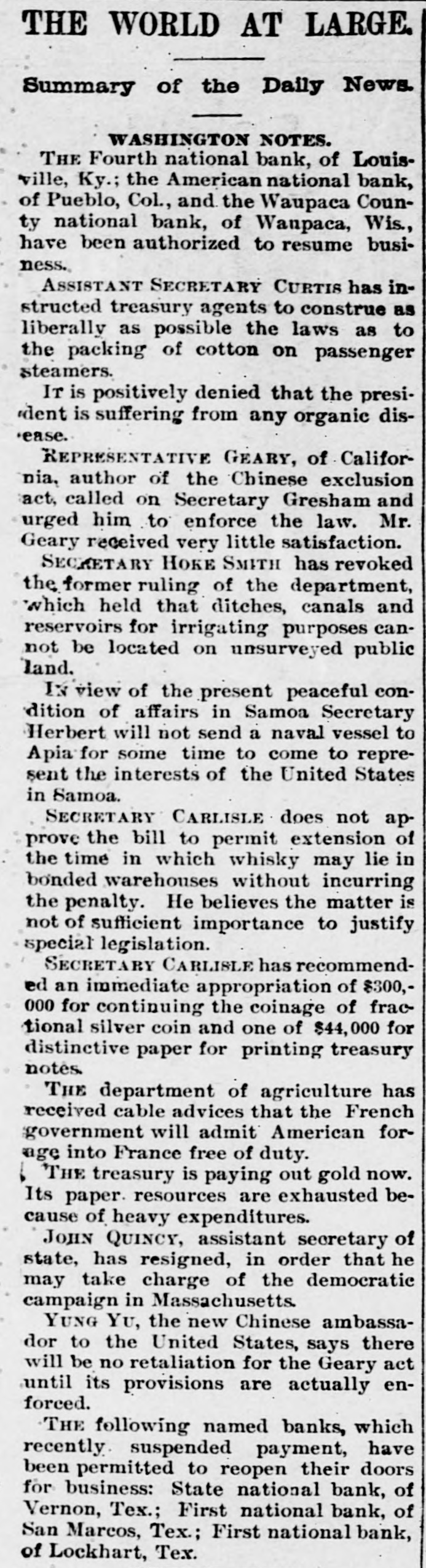 THE WORLD AT LARGE. Summary of the Daily News. WASHINGTON NOTES. THE Fourth national bank, of Louisville, Ky.; the American national bank, of Pueblo, Col., and the Waupaca County national bank, of Wanpaca, Wis., have been authorized to resume business. ASSISTANT SECRETARY CURTIS has instructed treasury agents to construe as liberally as possible the laws as to the packing of cotton on passenger steamers. IT is positively denied that the president is suffering from any organic disease. REPRESENTATIVE GEARY, of California, author of the Chinese exclusion act, called on Secretary Gresham and urged him to enforce the law. Mr. Geary received very little satisfaction. SECRETARY HOKE SMITH has revoked the former ruling of the department, which held that ditches, canals and reservoirs for irrigating purposes cannot be located on unsurveyed public land. IN view of the present peaceful condition of affairs in Samoa Secretary Herbert will not send a naval vessel to Apia for some time to come to represent the interests of the United States in Samoa. SECRETARY CARLISLE does not approve the bill to permit extension of the time in which whisky may lie in bonded warehouses without incurring the penalty. He believes the matter is not of sufficient importance to justify special legislation. SECRETARY CARLISLE has recommended an immediate appropriation of $300,000 for continuing the coinage of fractional silver coin and one of $44,000 for distinctive paper for printing treasury notes THE department of agriculture has received cable advices that the French government will admit American forage into France free of duty. 1 THE treasury is paying out gold now. Its paper. resources are exhausted because of heavy expenditures. JOHN QUINCY, assistant secretary of state, has resigned, in order that he may take charge of the democratic campaign in Massachusetts. YUNG Yu, the new Chinese ambassador to the United States, says there will be no retaliation for the Geary act until its provisions are actually enforced. THE following named banks, which recently suspended payment, have been permitted to reopen their doors for business: State national bank, of Vernon, Tex.; First national bank, of San Marcos, Tex.; First national bank, of Lockhart, Tex.
