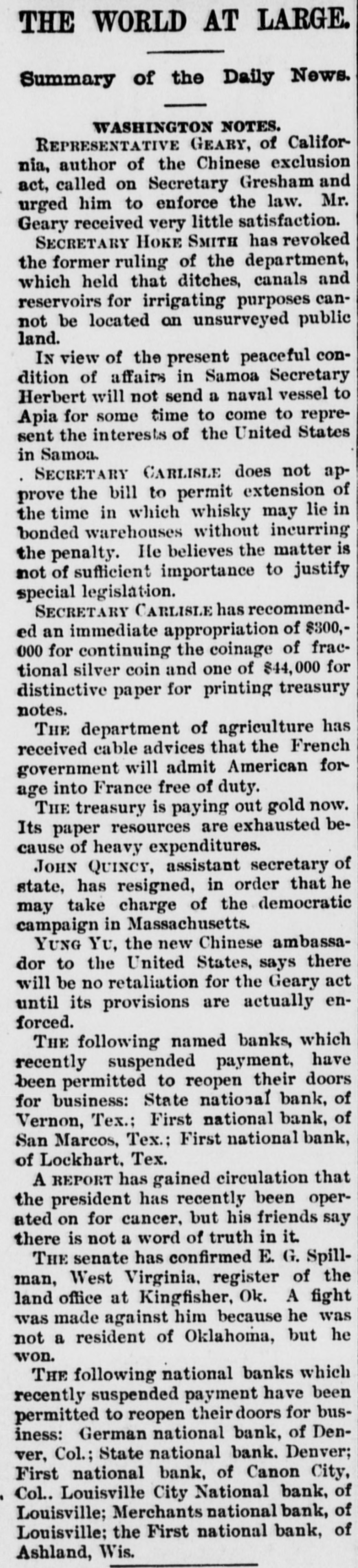 THE WORLD AT LARGE. Summary of the Daily News. WASHINGTON NOTES. REPRESENTATIVE GEARY, of California, author of the Chinese exclusion act, called on Secretary Gresham and urged him to enforce the law. Mr. Geary received very little satisfaction. SECRETARY HOKE SMITH has revoked the former ruling of the department, which held that ditches, canals and reservoirs for irrigating purposes cannot be located on unsurveyed public land. IN view of the present peaceful condition of affairs in Samoa Secretary Herbert will not send a naval vessel to Apia for some time to come to represent the interests of the United States in Samoa. SECRETARY CARLISLE does not approve the bill to permit extension of the time in which whisky may lie in bonded warehouses without incurring the penalty. He believes the matter is not of sufficient importance to justify special legislation. SECRETARY CARLISLE has recommended an immediate appropriation of $300,000 for continuing the coinage of fractional silver coin and one of $44,000 for distinctive paper for printing treasury notes. THE department of agriculture has received cable advices that the French government will admit American for age into France free of duty. THE treasury is paying out gold now. Its paper resources are exhausted because of heavy expenditures. JOHN QUINCY, assistant secretary of state, has resigned, in order that he may take charge of the democratic campaign in Massachusetts. YUNG Yu, the new Chinese ambassador to the United States, says there will be no retaliation for the Geary act until its provisions are actually enforced. THE following named banks, which recently suspended payment, have been permitted to reopen their doors for business: State national bank, of Vernon, Tex.: First national bank, of San Marcos, Tex.: First national bank, of Lockhart. Tex. A REPORT has gained circulation that the president has recently been operated on for cancer, but his friends say there is not a word of truth in it. THE senate has confirmed E. G. Spillman, West Virginia. register of the land office at Kingfisher, Ok. A fight was made against him because he was not a resident of Oklahoma, but he won. THE following national banks which recently suspended payment have been permitted to reopen their doors for business: German national bank, of Denver, Col.; State national bank. Denver; First national bank, of Canon City, Col.. Louisville City National bank, of Louisville; Merchants national bank, of Louisville: the First national bank, of Ashland, Wis.