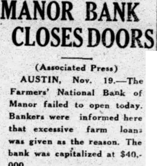BANK (Associated Press) AUSTIN, Nov. Farmers' National Bank of Manor failed to open today. Bankers informed here that excessive farm given the reason. The bank was capitalized 000.