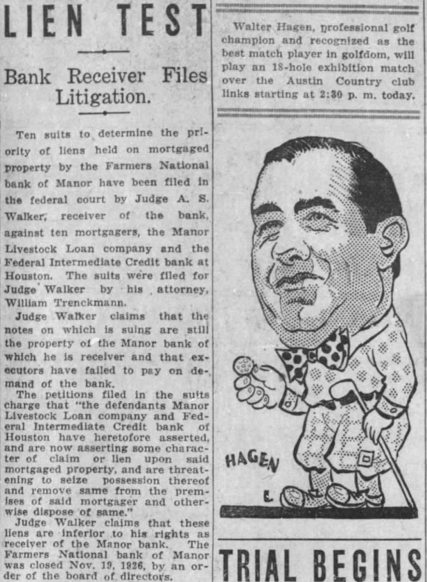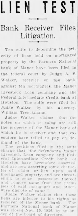 LIEN TEST Bank Receiver Files Litigation. Ten suits to determine the prlority of liens held on mortgaged property by the Farmers National bank of Manor have been filed in the federal court by Judge Walker, receiver of the bank, against ten mortgagers, the Manor Livestock Loan company and the Federal Credit bank at Houston. The suits were filed for Judge Walker by his attorney, William Trenckmann. Judge Walker claims that the notes which suing are still the of the Manor bank of which he is receiver and that executors failed to pay on demand of the The filed the suits charge that "the defendants Manor Livestock Loan company and Federal Intermediate Credit bank Houston have heretofore asserted, and are character claim lien upon and are threatening seize thereof same from the premof said mortgager and otherwise dispose of same. Judge Walker claims that these liens inferior to his rights receiver the The Farmers bank of Manor was closed Nov. 19. 1926, by an or- TRIAL BEGINS der of the board directors.