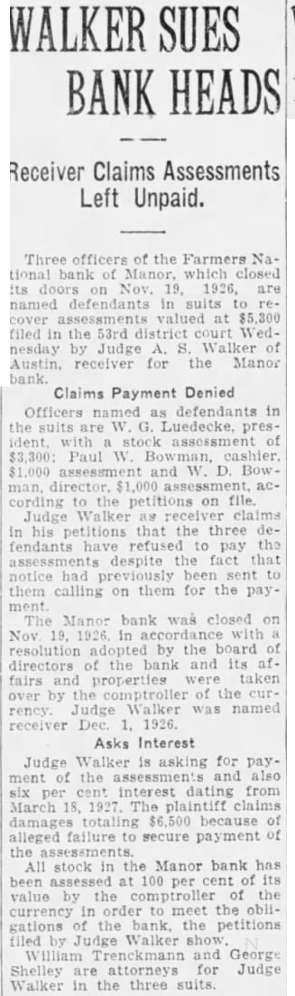WALKER SUES BANK HEADS Receiver Claims Assessments Left Unpaid. Three officers of the Farmers National bank of Manor. closed its on 1926, are named defendants in suits cover assessments valued at $5,300 filed in the 53rd district court Wednesday by Judge S. Walker of Austin, receiver for the Manor bank. Claims Payment Denied Officers as defendants in the suits are W. Luedecke, pres$3,300 Paul W. Bowman, cashier, $1,000 assessment and W. D. Bow cording to the petitions on file. Judge Walker as claims in his petitions that the three defendants have refused pay the assessments despite the fact that notice had previously been sent to them calling on them for the pay. ment The Manor bank was closed on resolution adopted by the board directors of the bank and its af fairs and properties were taken over by the of the currency Judge Walker was named receiver Dec. 1926. Asks Interest Judge Walker is asking for payment of the and also six per cent interest dating from March 18, 1927. The plaintiff claims damages totaling $6,500 because alleged failure to secure payment of the All stock in the Manor bank has been assessed at 100 per cent of its value by the comptroller of the currency in order to meet the obligations of the bank, the petitions filed by Judge Walker show William Trenckmann and George Shelley are attorneys for Judge Walker in the three suits.