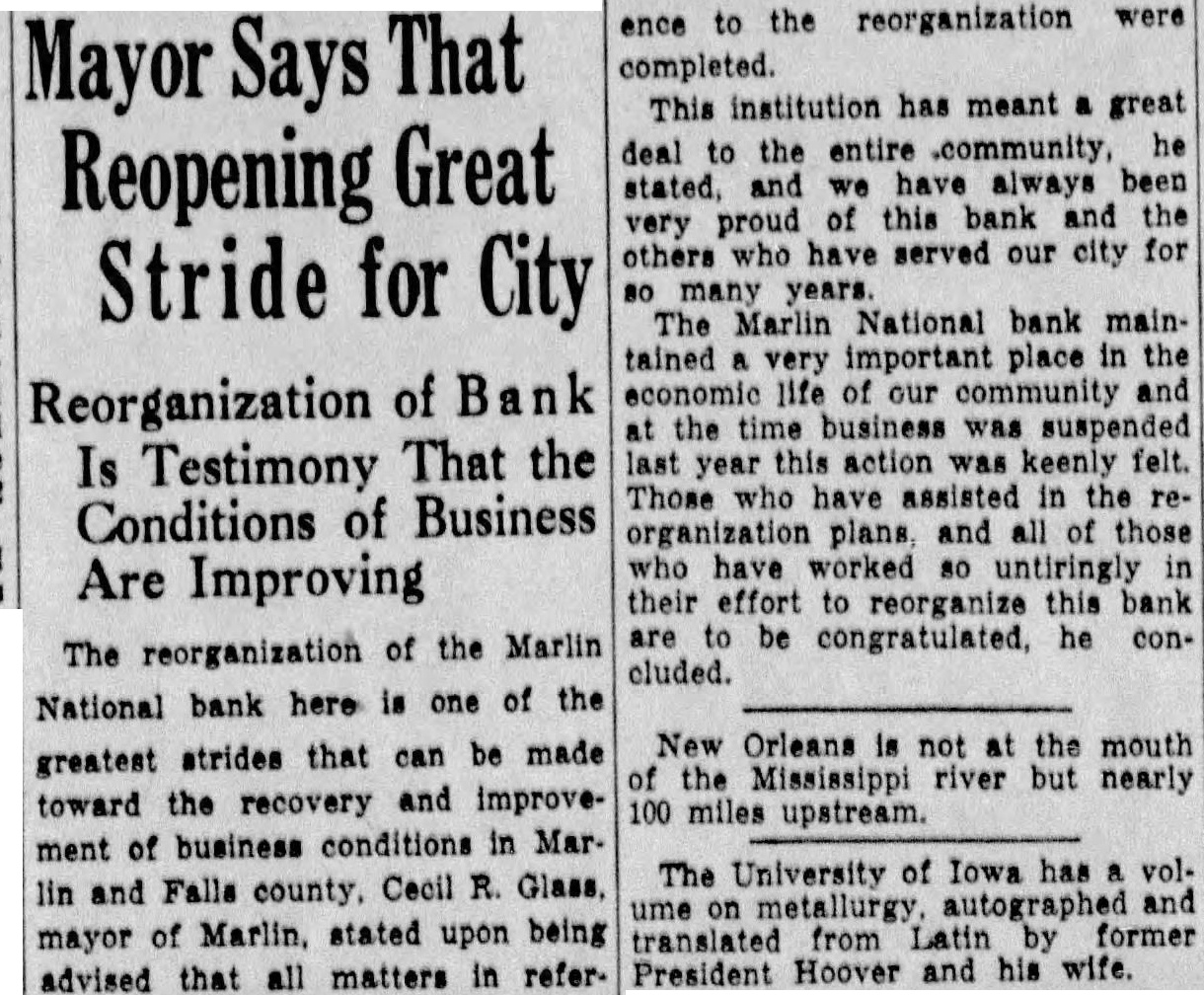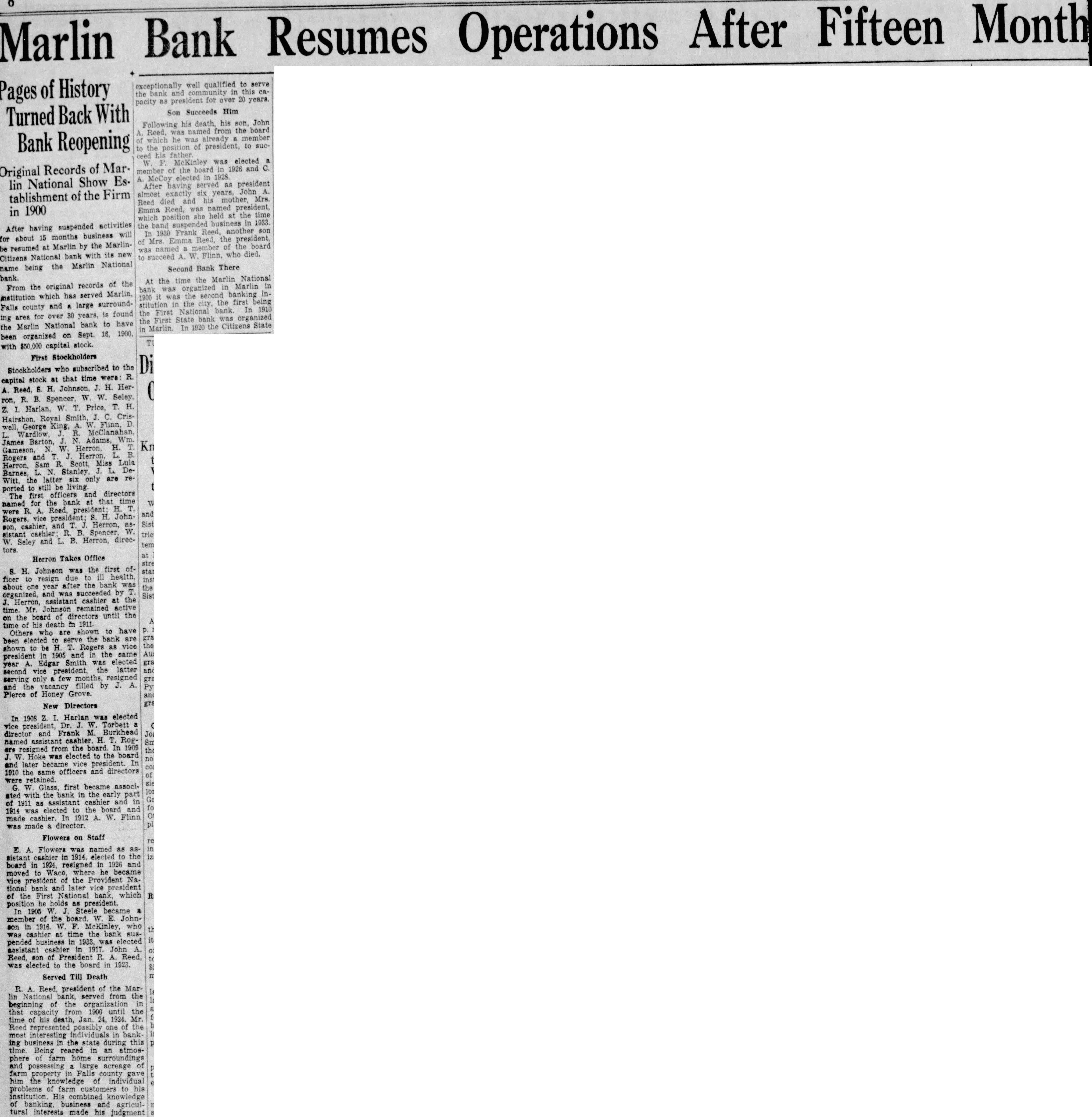 6 Month Fifteen After Marlin Bank Resumes Operations Pages of History Turned Back With Bank Reopening Original Records of Marlin National Show Establishment of the Firm in 1900 suspended activities After having business will about 15 months for Marlin by the Marlinbe resumed at bank with its new Citizens National to Marlin National being the name records of the From the original has served which county and large Falls is found area for over 30 years, ing National bank to have the Marlin on Sept. 1900, been organized with capital stock. First Stockholders who subscribed to the time were R. capital stock at that H. HerA. S. H. Spencer, W. W. ron, R. B. W. T. Price, T. H. z. Harlan, C. CrisHairshon. Royal W. Flinn, D George Wardlow Adams, Wm James W. H. Rogers and R. Scott, Miss Lula Sam DeBarnes, the latter six only are ported to still living officers and directors The first bank that named for the were R. A. Reed, Johnvice and Herron, sistant cashier L. B. Herron, direcSeley Herron Takes Office Johnson was the first H. ficer to resign due to after the bank about one year and was succeeded assistant cashier at the Herron, time Mr Johnson remained active board of directors until the on the time his death m 1911. shown to have Others who are been elected to serve the bank are shown to be H. Rogers as president 1905 and the same year Edgar Smith was elected the latter second vice serving only few months, resigned vacancy filled by J. A. and the Pierce of Honey Grove. New Directors Harlan was elected In 1908 president, Torbett vice and Frank M. Burkhead director cashier. H. T. named from the board. In 1909 resigned the Hoke was elected to the board and later became vice president. In 1910 the same officers and directors of were retained. sier, G. first became ated with the bank in the early part of assistant cashier and as and for 1914 was elected to the board made cashier. In 1912 A. W. Flinn was made director. Flowers on Staff E. A. Flowers was named as assistant cashier in elected to the board in resigned in 1926 moved Waco, where became vice president of the Provident National bank and later vice president of the First National bank, which position holds president. 1905 W Steele became member the board. W. E. Johnson in W. who the cashier at time the bank suspended business in 1933, was elected its assistant cashier in 1917. John of Reed. son of R. Reed, was elected to the board in 1923. Served Till Death R. A. Reed. president of the MarNational bank, served from the beginning of the organization that capacity from 1900 until the time of his Jan 24, 1924. Mr. represented possibly of the most interesting individuals bank- in ing business in the state during this time. Being reared in an atmosphere of farm home surroundings and possessing large acreage of farm property in Falls county gave him the knowledge of individual problems of farm to his institution His combined knowledge of business and tural interests made his judgment exceptionally well qualified in to serve bank and this the for over 20 years. pacity as president Son Succeeds Him his John Following named from the board he member of president, to sucthe his elected the board and member of in served as president After John almost exactly Mrs and his Reed, named she the in 1933. the band another son the Mrs member of the board who died. A. W. Bank There Marlin National At the the in Marlin bank second banking the being stitution In bank was organized Citizens State In in
