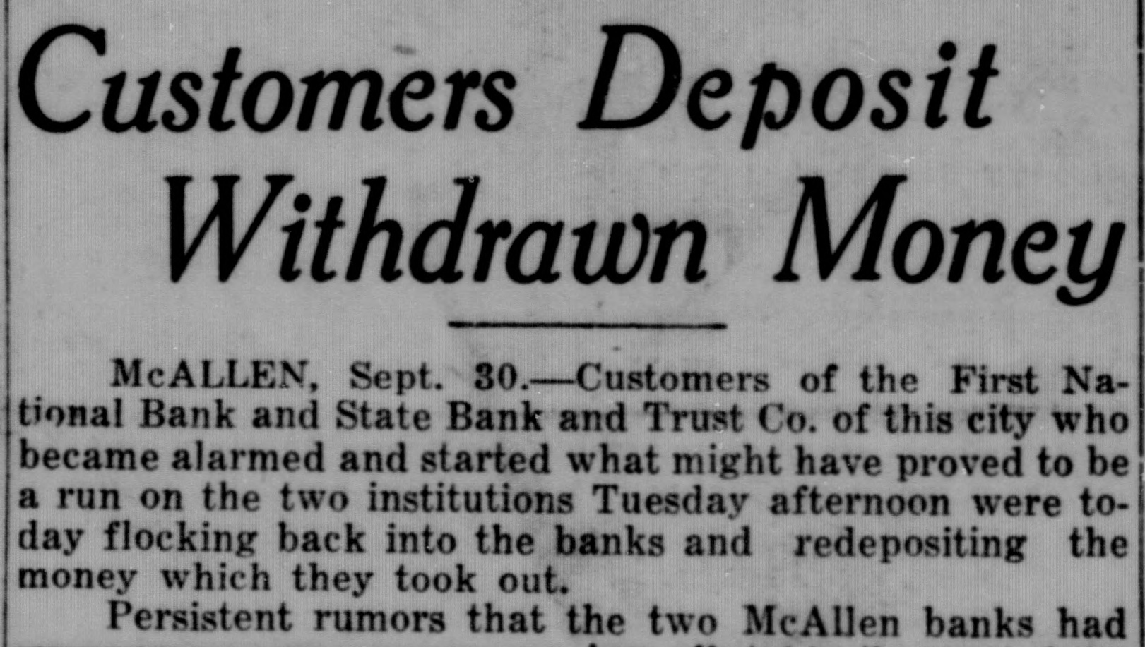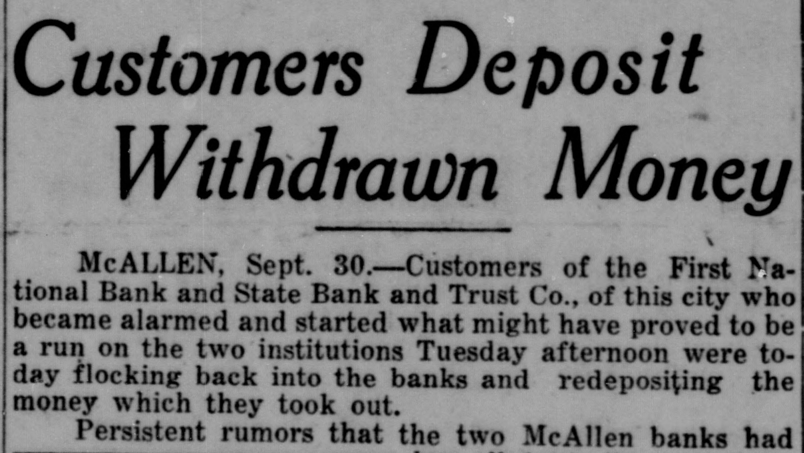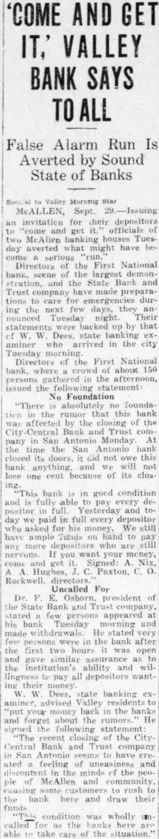 Valley Morning Star McALLEN, Sept. invitation for depositors "come get officials banking houses Tuesday averted what might have come serious Directors of the First National bank, scene the largest demonand the State Bank and Trust company made preparations to care for during the next few days, they Tuesday night. Their backed up by that Dees, state aminer who arrived in the city Tuesday Directors of the First National bank, where crowd about 150 gathered in the afternoon, persons issued the following statement: No Foundation "There absolutely the rumor that this bank affected by the closing of the Bank and Trust company San Antonio Monday the time the San Antonio closed its doors, not owe this bank and will not lose one cent because of its closing. bank in good condition and fully able pay every positor in full Yesterday and day paid every depositor asked his money. have ample Tutnds on hand to any more depositors who are nervous. you want your money, and Signed: Nix, Hughes, Paxton, Rockwell, directors. Uncalled For