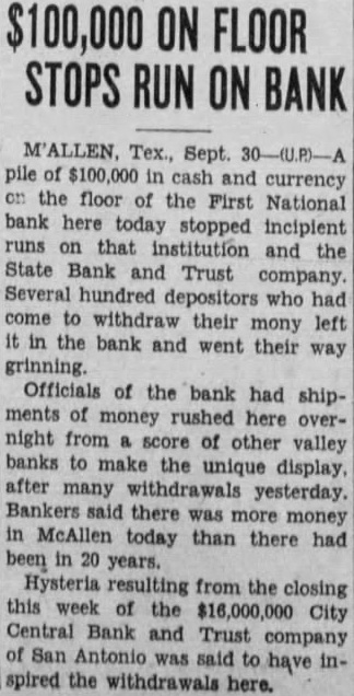 Dr. Osborn. president the State Bank and Trust company, stated few persons appeared his morning and made withdrawals. He stated the bank after the first two hours open and similar assurance the institution's ability and willingness pay depositors ing their money Dees, state banking advised Valley your money back the banks and forget about the rumors. He signed following statement: recent closing of the CityCentral Bank and Trust company San Antonio seems to have ated feeling uneasiness and discontent in minds the ple McAllen and community, some customers to rush the bank here and draw their funds condition was wholly the banks here take the situation."