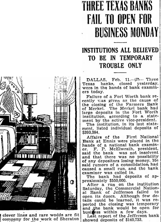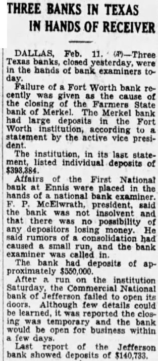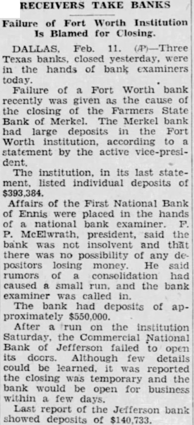 THREE TEXAS BANKS FAIL TO OPEN FOR BUSINESS MONDAY INSTITUTIONS ALL BELIEVED TO BE IN TEMPORARY TROUBLE ONLY Texas banks, closed yesterday, were in the hands of bank examincrs today. Failure of a Fort Worth bank recently was given as the cause of the closing of the Farmers Bank of Merkel. The Merkel bank had large deposits in the Fort Worth institu according to statement by the active vice-president. The institution. in its last statement. listed individual deposits of $393,384. Affairs of the First National Bank at Ennis were placed in the hands of a national bank examincr. F. P. McElwrath. president. said the bank was not insolvent and that there was no possibility of any depositors losing money. He said rumors of a consolidation had caused a small run, and the bank examiner was called in. The bank had deposits of ap$550,000. @ After a run on the institution Saturday, the Commercial National Bank of Jefferson failed to open its doors. Although few details could be learned, it was reported the closing was temporary and the bank would be open for business within R few days. Last report of the Jefferson bank showed deposits of $140,733.
