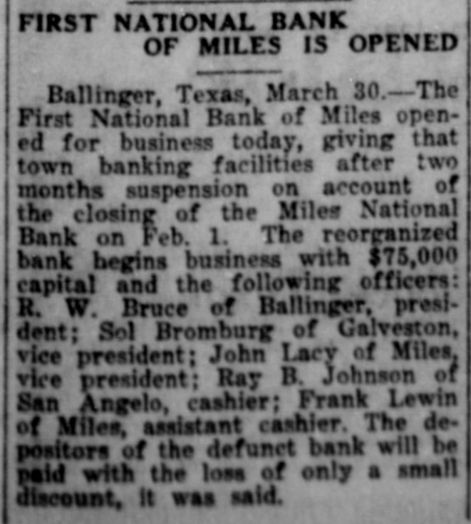 FIRST NATIONAL BANK OF MILES IS OPENED Ballinger, Texas, March 30.-The First National Bank of Miles opened for business today, giving that town banking facilities after two months suspension on account of the closing of the Miles National Bank on Feb. 1. The reorganized bank begins business with $75,000 capital and the following officers: R. W. Bruce of Ballinger, president; Sol Bromburg of Galveston, vice president: John Lacy of Miles, vice president; Ray B. Johnson of San Angelo, cashier; Frank Lewin of Miles, assistant cashier. The depositors of the defunct bank will be paid with the loss of only a small discount, It was said.