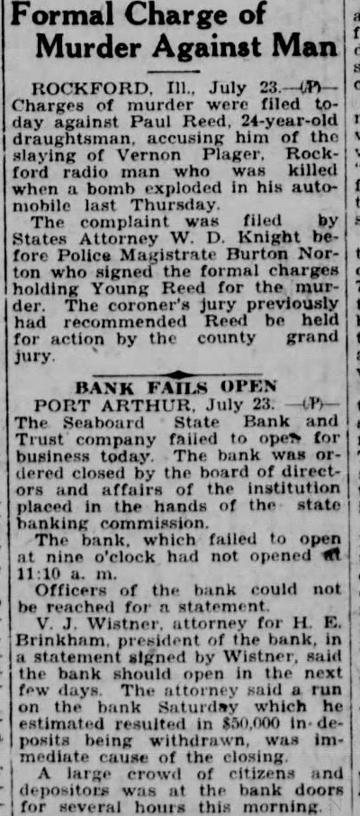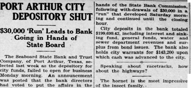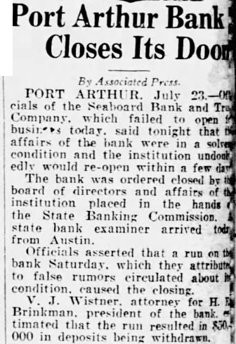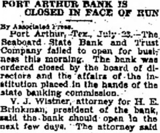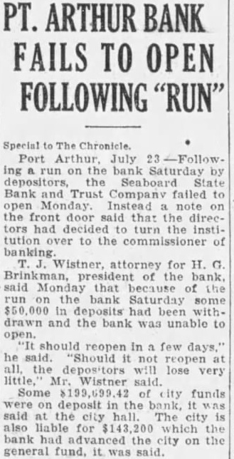 PT. ARTHUR BANK FAILS TO OPEN FOLLOWING "RUN" Port Arthur. July on Saturday by depositors, Seaboard Bank and Trust Company failed Monday. Instead note the front door that the direchad turn the institution to the commissioner of banking for the Monday that bank Saturday some drawn and the bank unable to should reopen in few days," "Should not reopen the lose very little,' Mr. Wistner Some city funds deposit the bank, said The city also liable for bank had advanced the city on the general fund, said.