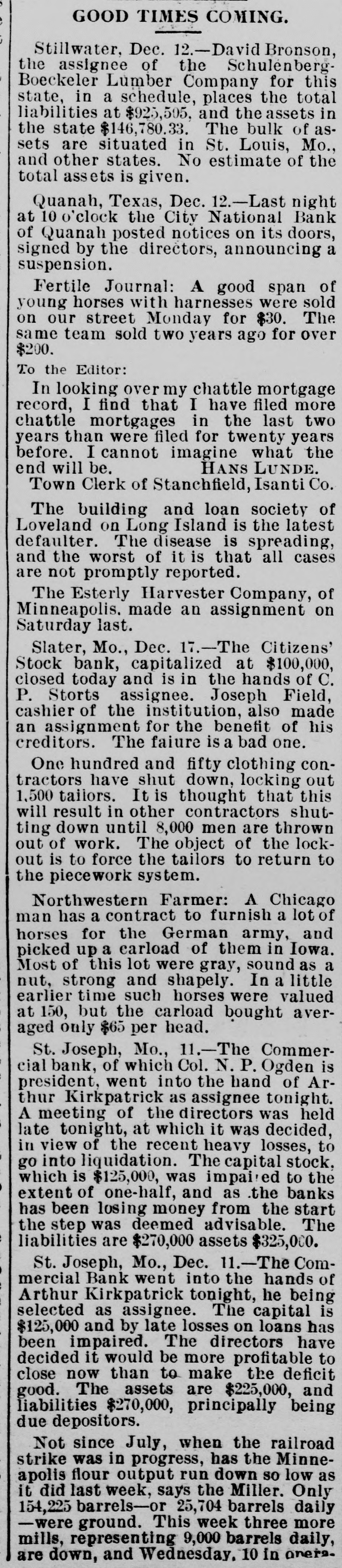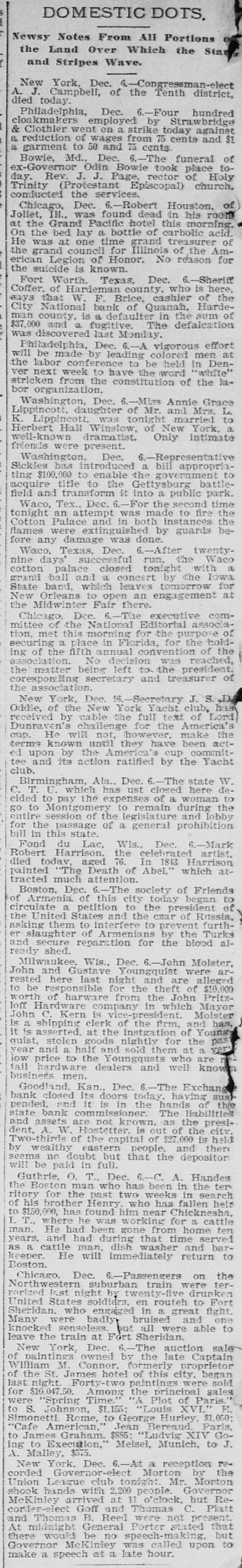 DOMESTIC DOTS, Newsy Notes From All Portions the Land Over Which the Star and Stripes Wave. New York. Dec. -Congressman-elect A. J. Campbell, of the Tenth district, died today. Philadelphia, Dec. 6.-Four hundred cloakmakers employed by Strawbridge & Clothier went on a strike today against a reduction of wages from 75 cents and $1 a garment to 50 and 75 cents Bowie, Md., Dec. 6.-The funeral of ex-Governor Odin Bowie took place today. Rev. J. J. Page, rector of Holy Trinity (Protestant Episcopal) church, conducted the services. Chicago, Dec. 6.-Rober't Houston. of Joliet. IN., was found dead in his room at the Grand Pacific hotel this morning. On the bed lay a bottle of carbolic acid. He was at one time grand treasurer of the grand council for Illinois of the American Legion of Honor. No reason for the suicide is known. Fort Worth. Texas, Dec. 6.-Sheriff Coffer. of Hardeman county, who is here. says that W. F. Brice, cashier of the City National bank of Quanah. Hardeman county, is a defaulter in the sum of $37,000 and a fugitive. The defalcation was discovered last Monday. Philadelphia, Dec. 6.-A vigorous effort will be made by leading colored men at the labor conference to be held in Denver next week to have the word "white" stricken from the constitution of the labor organization. Washington, Dec. 6.-Miss Annie Grace Lippincott. daughter of Mr. and Mrs. L. K. Lippincott. was tonight married to Herbert Hall Winslow, of New York, a well-known dramatist. Only intimate friends were present. Washington, Dec. 6.-Representative Sickles has introduced a bill appropriating $100,000 to enable the government to acquire title to the Gettysburg battlefield and transform it into a public park. Waco, Tex., Dec. For the second time tonight an attempt was made to fire the Cotton Palace and in both instances the flames were extinguished by guards before any damage was done. Waco, Texas, Dec. 6.-After twentynine days' successful run. the Waco cotton palace closed tonight with a grand ball and a concert by the Iowa State band, which leaves tomorrow for New Orleans to open an engagement at the Midwinter Fair there. Chicago, Dec. 6.-The executive committee of the National Editorial association, met this morning for the purpose of securing a place in Florida, for the holdthe JO чту the JO Sup association. No decision was reached, the matter being left to the president. coresponding secretary and treasurer of the association. New York, Dec. 16.-Secretary J. S. D. Oddie, of the New York Yacht club, has received by cable the full text of Lord Dunraven's challenge for the America's cup. He will not, however. make the terms known until they have been acted upon by the America's cup committee and its action ratified by the Yacht club. Birmingham, Ala., Dec. 6.-The state W. C. T. U. which has ust closed here decided to pay the expenses of a woman to go to Montgomery to remain during the entire session of the legislature and lobby for the passage of a general prohibition state this up 1119 Fond du Lac. Wis.. Dec. 6.-Mark Robert Harrison. the celebrated artist, died today, aged 76. In 1843 Harrison painted "The Death of Abel, which attracted much attention. Boston. Dec. 6.-The society of Friends of Armenia of this city today began to circulate a petition to the president of the United States and the czar of Russia, asking them to interfere to prevent further slaughter of Armenians by the Turks and secure reparation for the blood already shed. Milwaukee. Wis., Dec. 6.-John Molster, John and Gustave Youngquist were arrested here last night and are alleged to be responsible for the theft of $10.000 worth of harware from the John Pritzloff Hardware company in which Mayor John C. Kern is vice-president. Molster is a shipping clerk of the firm, and has, it is asserted. at the instgation of Young quist. stolen goods nightly for the pas year and a half and sold them at a iow price to the Youngqusts who are tail hardware dealers and well known business men. Goodland. Kan., Dec. 6.-The Exchang bank closed its doors today. having sush pended. and it is in the hands of the state bank commissioner. The liabilities and assets are not known. as the president, A. W. Hostetter. is out of the citv. Two-thirds of the capital of $27,000 is held by wealthy eastern people, and there seems no doubt but that the depositor will be paid in full. Guthrie, O. T., Dec. 6.-C. A. Handes the Boston man who has been in the ter ritory for the past two weeks in search of his brother Henry, who has fallen heir to $150,000, has found him near Chicknesha, T. T., where he was working for a cattle man. He had been gone from home ten years, and had during that time served as a cattle man, dish washer and barkeeper. He will immediately return to Boston. Chicago. Dec. 6.-Passengers on the Northwestern suburban train were terporized last night by twenty-five drunken United States soldiers, en routeh to Fort Sheridan. who engaiged in a great fight. Many were badly bruised and one knocked senseless. put all were able to leave the train at Fort Sheridan. New York, Dec. 6.-The auction sale of paintings owned by the late Captain William M. Connor. formerly proprietor of the St. James hotel of this city, began last night. Forty-two paintings were sold for $10,047.50. Among the principal sales were "Spring Time." "A Plot of Paris." to S. Johnson, $1.155: "Louis XVI." E. Simonetti Rome, to George Hurley, .050: "Cafe American.' Jean Bereaud Paris, to James Graham. $885: "Ludvig XIV Going to Execution," Meisel, Munich, to J. Malley F New York. Dec. 6.-At a reception recorded Morton hv the