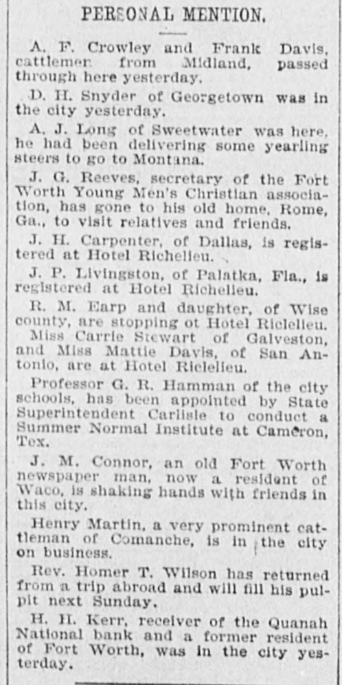 TELEGRAPH BREVITIES. St. Joseph, Mo., Commercial bank has assigned. Corbett will train in Hot Springs. Quanab, Texas, National bank has closed its doors. Commercial Hotel, Luffkin, Texas, burned yesterday; $8,000 loss. Milton Nobles' dramatic company have appeared in Corpus Christi and Laredo. T. E. Sanderfur, a young man from Floresvile, was found murdered six miles from Karnes City yesterday. Wells Fargo Express company's safe at Devers, 54 miles east of Houston, was robbed yesterday. Druggist J. A. Degaugh filed deed of trust for the benefit of his creditors, yesterda, in Austin. Child of Sam Lazzio, Italian, of Houston, was murdered yesterdav by an assassin who was after its father's wealth. Mark Gordon kills Fred Ahldag, near Wharton, Texas, while both were deer hunting. Corpus Christi has a proposition from Alexander Brown & Sons, of Baltimore, to deepen the water over the bar at the Pass there, for a $600,000 land bonus. Frank Falconer suicides in Austin, on account of a quarrel with his wife. Belton, Texas. Opera House company is now chartered. Senate of Georgia refuses to confirm the governor's appointment of John D. Berry to be judge of the Atlantic Criminal court. R. D Wilbourn, of Henrietta, Texas, killed Octavious Selvig, a barkeeper in Chicago yesterdav. while in half maudlin condition from drink. The agricultural department of the A. and M. College of Bryan, has chosen a S te of 151 acres near Beeville, for a substation for experimental work. Dr. Thompson, of Temple, Texas, has been offered the superintendency of the Southwestern Insane asylum by Gov.elect Culberson. Gov.-Elect Culberson has appointed the following: Secretary of State-Allison Mayfield, of Grayson county. Adjutant General-W. H. Mabry, of Marion county. Commissioner of Agriculture - A. J. Rose, of Bell county. State Health Officer-R. M. Swearingen, of Travis county. Superintendent of Blind Institute-E. P. B cton. of Hopkins county. Superintendent of Deaf and Dumb Institute-A. R. Rose, of Hill county. Penitentiary Board-Joe Gunter, of Dallas county: William Clemens, of Comal county, and S. M. Fry, of Tarrant county. Financial Agent of PenitentiariesJoseph S. Rice, of Tyler county. Assistant Financial Agent-N. M. Harrison, of Upshur county. Superintendent of State ReformatoryJ. F. McGuire, of Fayette county. Board of Pardon Advisors-W. B. Dunham and W.C. Denson, of Travis county.