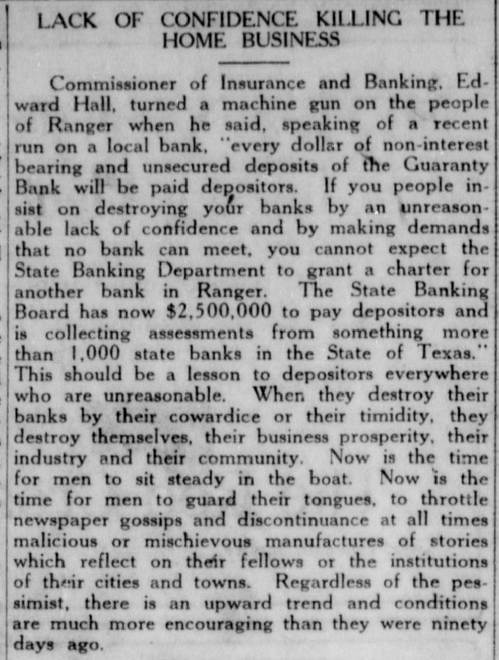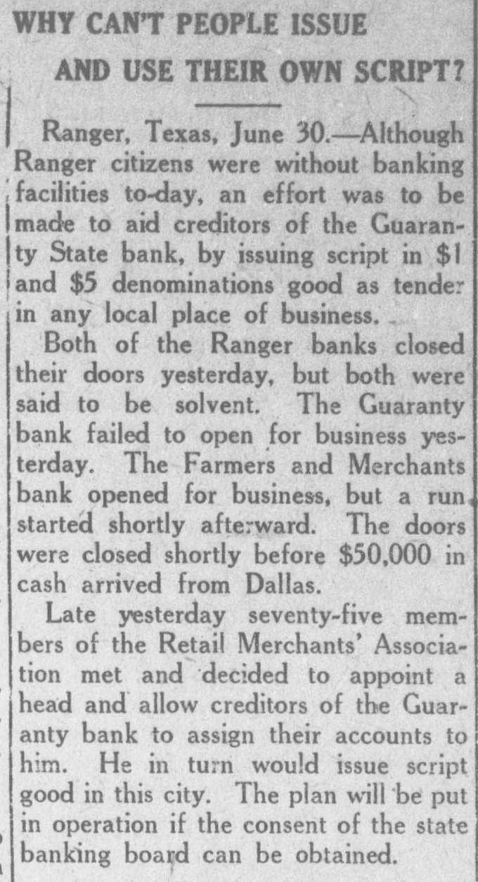 WHY CAN'T PEOPLE ISSUE AND USE THEIR OWN SCRIPT? Ranger, Texas, June 30.-Although Ranger citizens were without banking facilities to-day, an effort was to be made to aid creditors of the Guaranty State bank, by issuing script in $1 and $5 denominations good as tender in any local place of business. Both of the Ranger banks closed their doors yesterday, but both were said to be solvent. The Guaranty bank failed to open for business yesterday. The Farmers and Merchants bank opened for business, but a run started shortly afterward. The doors were closed shortly before $50,000 in cash arrived from Dallas. Late yesterday seventy-five members of the Retail Merchants' Association met and decided to appoint a head and allow creditors of the Guaranty bank to assign their accounts to him. He in turn would issue script good in this city. The plan will be put in operation if the consent of the state banking board can be obtained.