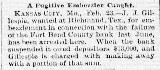A Fugitive Embezzler Caught. KANSAS CITY, Mo., Feb. 23.-J. J. Gillesple, wanted at Richmand, Tex., for embezzlement in connection with the failure of the Fort Bend County bank last June, has been arrested here. When the bank suspended it owed depositors $13,000, and Gillespie is charged with making away with a portion of that sum.