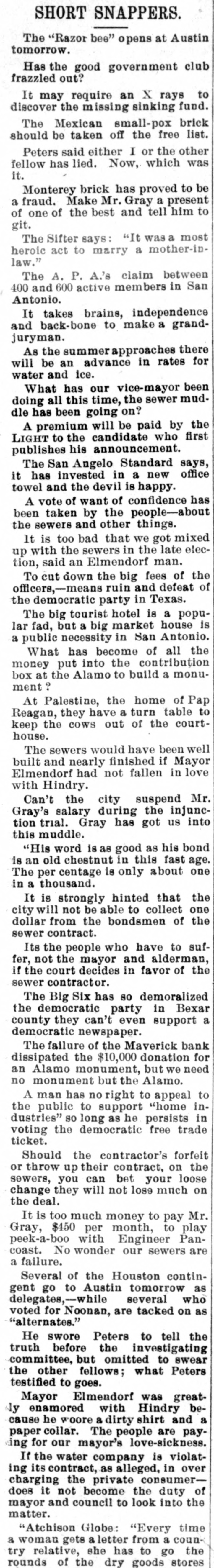 # SHORT SNAPPERS. The "Razor bee" opens at Austin tomorrow. Has the good government club frazzled out? It may require an X rays to discover the missing sinking fund. The Mexican small-pox brick should be taken off the free list. Peters said either I or the other fellow has lied. Now, which was it. Monterey brick has proved to be a fraud. Make Mr. Gray a present of one of the best and tell him to git. The Sifter says: "It was a most heroic act to marry a mother-in-law." The A. P. A.'s claim between 400 and 600 active members in San Antonio. It takes brains, independence and back-bone to make a grand-juryman. As the summer approaches there will be an advance in rates for water and ice. What has our vice-mayor been doing all this time, the sewer muddle has been going on? A premium will be paid by the LIGHT to the candidate who first publishes his announcement. The San Angelo Standard says, it has invested in a new office towel and the devil is happy. A vote of want of confidence has been taken by the people about the sewers and other things. It is too bad that we got mixed up with the sewers in the late election, said an Elmendorf man. To cut down the big fees of the officers,-means ruin and defeat of the democratic party in Texas. The big tourist hotel is a popular fad, but a big market house is a public necessity in San Antonio. What has become of all the money put into the contribution box at the Alamo to build a monument? At Palestine, the home of Pap Reagan, they have a turn table to keep the cows out of the court-house. The sewers would have been well built and nearly finished if Mayor Elmendorf had not fallen in love with Hindry. Can't the city suspend Mr. Gray's salary during the injunction trial. Gray has got us into this muddle. "His word is as good as his bond is an old chestnut in this fast age. The per centage is only about one in a thousand. It is strongly hinted that the city will not be able to collect one dollar from the bondsmen of the sewer contract. Its the people who have to suffer, not the mayor and alderman, if the court decides in favor of the sewer contractor. The Big Six has so demoralized the democratic party in Bexar county they can't even support a democratic newspaper. The failure of the Maverick bank dissipated the $10,000 donation for an Alamo monument, but we need no monument but the Alamo. A man has no right to appeal to the public to support "home industries" so long as he persists in voting the democratic free trade ticket. Should the contractor's forfeit or throw up their contract, on the sewers, you can bet your loose change they will not lose much on the deal. It is too much money to pay Mr. Gray, $450 per month, to play peek-a-boo with Engineer Pancoast. No wonder our sewers are a failure. Several of the Houston contingent go to Austin tomorrow as delegates,-while several who voted for Noonan, are tacked on as "alternates." He swore Peters to tell the truth before the investigating committee, but omitted to swear the other fellows; what Peters testified to goes. Mayor Elmendorf was greatly enamored with Hindry because he woore a dirty shirt and a paper collar. The people are paying for our mayor's love-sickness. If the water company is violating its contract, as alleged, in over charging the private consumer-does it not become the duty of mayor and council to look into the matter. "Atchison Globe: "Every time a woman gets a letter from a country relative, she has to go the rounds of the dry goods stores