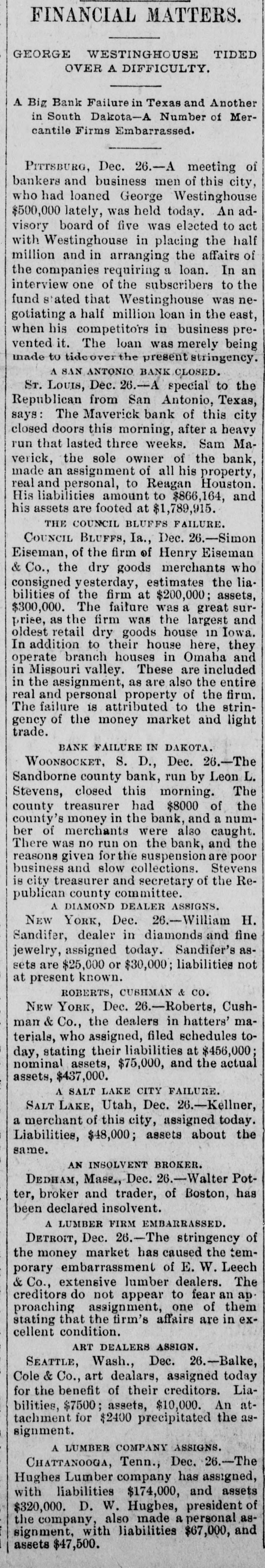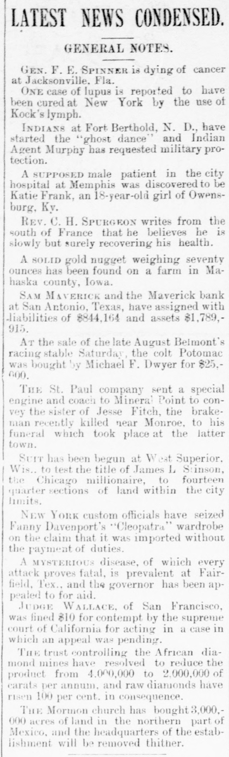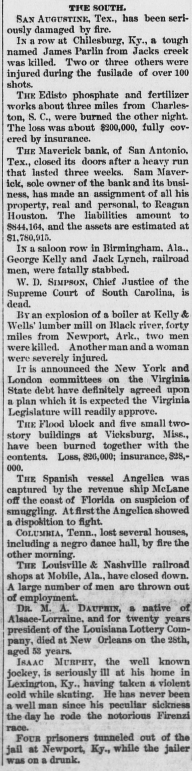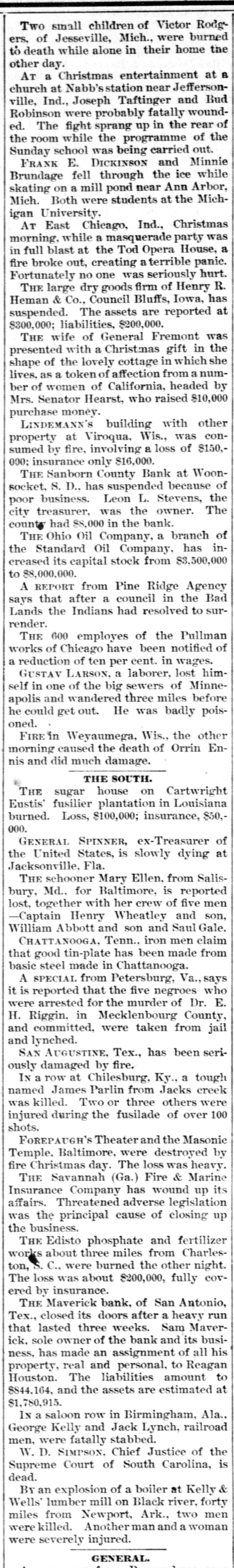 Two small children of Victor Rodgers. of Jesseville, Mich., were burned to death while alone in their home the other day. AT a Christmas entertainment at a church at Nabb'sstation near Jeffersonville, Ind., Joseph Taftinger and Bud Robinson were probably fatally wounded. The fight sprang up in the rear of the room while the programme of the Sunday school was being carried out. FRANK E. DICKINSON and Minnie Brundage fell through the ice while skating on a mill pond near Ann Arbor, Mich. Both were students at the Michigan University. AT East Chicago, Ind., Christmas morning, while a masquerade party was in full blast at the Tod Opera House, a fire broke out, creating a terrible panic. Fortunately no one was seriously hurt. THE large dry goods firm of Henry R. Heman & Co., Council Bluffs, Iowa, has suspended. The assets are reported at $300,000; liabilities, $200,000. THE wife of General Fremont was presented with a Christmas gift in the shape of the lovely cottage in which she lives, as a token of affection from a number of women of California, headed by Mrs. Senator Hearst, who raised $10,000 purchase money. LINDEMANN'S building with other property at Viroqua, Wis., was consumed by fire, involving a loss of $150,000; insurance only $16,000. THE Sanborn County Bank at Woonsocket, S. D., has suspended because of poor business. Leon L. Stevens, the city treasurer, was the owner. The county had $8,000 in the bank. THE Ohio Oil Company, a branch of the Standard Oil Company, has increased its capital stock from $3,500,000 to $8,000,000. A REPORT from Pine Ridge Agency says that after a council in the Bad Lands the Indians had resolved to surrender. THE 600 employes of the Pullman works of Chicago have been notified of a reduction of ten per cent. in wages. GUSTAV LARSON, a laborer, lost himself in one of the big sewers of Minneapolis and wandered three miles before he could get out. He was badly poisoned. FIRE in Weyaumega, Wis., the other morning caused the death of Orrin Ennis and did much damage. THE SOUTH. THE sugar house on Cartwright Eustis' fusilier plantation in Louisiana burned. Loss, $100,000; insurance, $50,000. GENERAL SPINNER, ex-Treasurer of the United States, is slowly dying at Jacksonville, Fla. THE schooner Mary Ellen, from Salisbury, Md., for Baltimore, is reported lost, together with her crew of five men -Captain Henry Wheatley and son, William Abbott and son and Saul Gale. CHATTANOOGA, Tenn., iron men claim that good tin-plate has been made from basic steel made in Chattanooga. A SPECIAL from Petersburg, Va., says it is reported that the five negroes who were arrested for the murder of Dr. E. H. Riggin, in Mecklenbourg County, and committed, were taken from jail and lynched. SAN AUGUSTINE, Tex., has been seriously damaged by fire. IN a row at Chilesburg, Ky., a tough named James Parlin from Jacks creek was killed. Two or three others were injured during the fusilade of over 100 shots. FOREPAUGH'S Theater and the Masonic Temple, Baltimore, were destroyed by fire Christmas day. The loss was heavy. THE Savannah (Ga.) Fire & Marine Insurance Company has wound up its affairs. Threatened adverse legislation was the principal cause of closing up the business. THE Edisto phosphate and fertilizer works about three miles from Charleston, C., were burned the other night. The loss was about $200,000, fully covered by insurance. THE Maverick bank, of San Antonio, Tex., closed its doors after a heavy run that lasted three weeks. Sam Maverick, sole owner of the bank and its business, has made an assignment of all his property, real and personal, to Reagan Houston. The liabilities amount to $844,164, and the assets are estimated at $1,780,915. IN a saloon row in Birmingham, Ala., George Kelly and Jack Lynch, railroad men, were fatally stabbed. W. D. SIMPSON. Chief Justice of the Supreme Court of South Carolina, is dead. By an explosion of a boiler at Kelly & Wells' lumber mill on Black river, forty miles from Newport, Ark., two men were killed. Another man and a woman were severely injured. GENERAL.