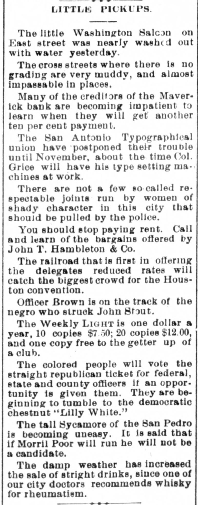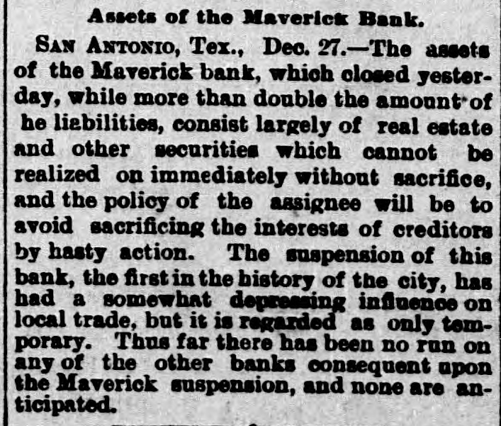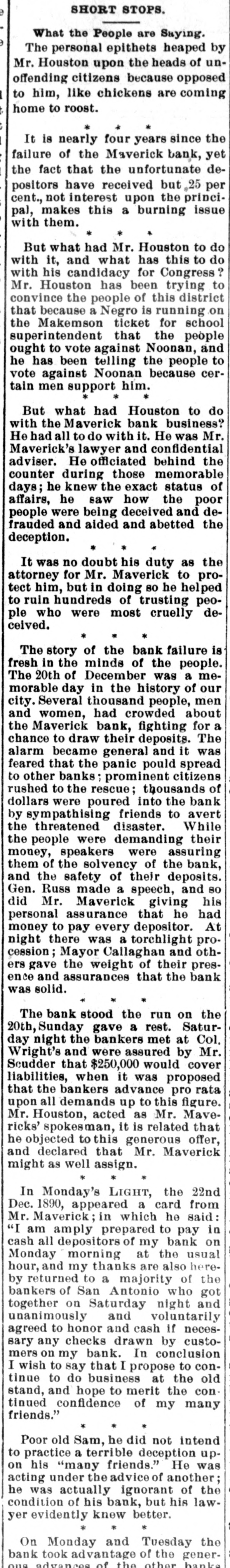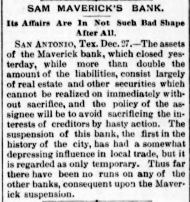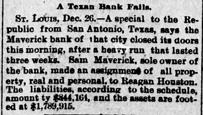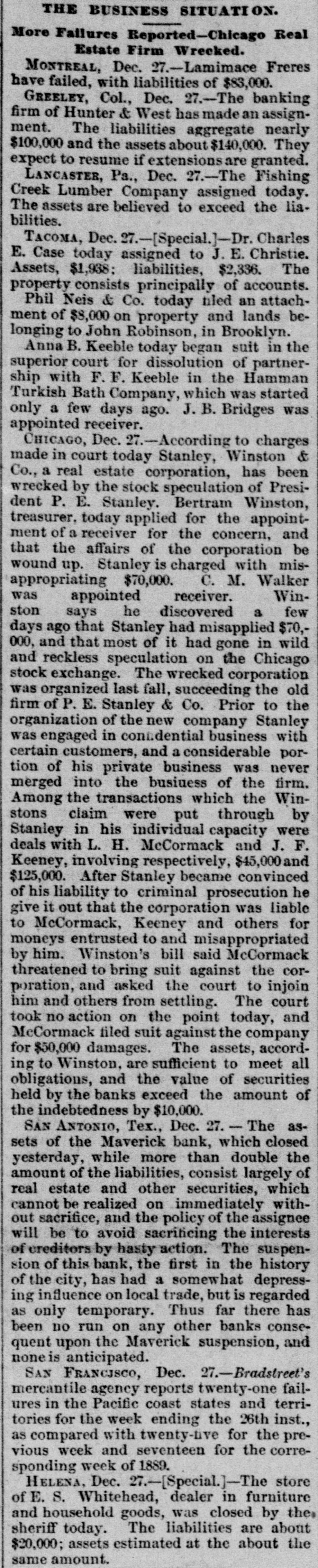 Two small children of Victor Rodgers. of Jesseville, Mich., were burned to death while alone in their home the other day. AT a Christmas entertainment at a church at Nabb'sstation near Jeffersonville, Ind., Joseph Taftinger and Bud Robinson were probably fatally wounded. The fight sprang up in the rear of the room while the programme of the Sunday school was being carried out. FRANK E. DICKINSON and Minnie Brundage fell through the ice while skating on a mill pond near Ann Arbor, Mich. Both were students at the Michigan University. AT East Chicago, Ind., Christmas morning, while a masquerade party was in full blast at the Tod Opera House, a fire broke out, creating a terrible panic. Fortunately no one was seriously hurt. THE large dry goods firm of Henry R. Heman & Co., Council Bluffs, Iowa, has suspended. The assets are reported at $300,000; liabilities, $200,000. THE wife of General Fremont was presented with a Christmas gift in the shape of the lovely cottage in which she lives, as a token of affection from a number of women of California, headed by Mrs. Senator Hearst, who raised $10,000 purchase money. LINDEMANN'S building with other property at Viroqua, Wis., was consumed by fire, involving a loss of $150,000; insurance only $16,000. THE Sanborn County Bank at Woonsocket, S. D., has suspended because of poor business. Leon L. Stevens, the city treasurer, was the owner. The county had $8,000 in the bank. THE Ohio Oil Company, a branch of the Standard Oil Company, has increased its capital stock from $3,500,000 to $8,000,000. A REPORT from Pine Ridge Agency says that after a council in the Bad Lands the Indians had resolved to surrender. THE 600 employes of the Pullman works of Chicago have been notified of a reduction of ten per cent. in wages. GUSTAV LARSON, a laborer, lost himself in one of the big sewers of Minneapolis and wandered three miles before he could get out. He was badly poisoned. FIRE in Weyaumega, Wis., the other morning caused the death of Orrin Ennis and did much damage. THE SOUTH. THE sugar house on Cartwright Eustis' fusilier plantation in Louisiana burned. Loss, $100,000; insurance, $50,000. GENERAL SPINNER, ex-Treasurer of the United States, is slowly dying at Jacksonville, Fla. THE schooner Mary Ellen, from Salisbury, Md., for Baltimore, is reported lost, together with her crew of five men -Captain Henry Wheatley and son, William Abbott and son and Saul Gale. CHATTANOOGA, Tenn., iron men claim that good tin-plate has been made from basic steel made in Chattanooga. A SPECIAL from Petersburg, Va., says it is reported that the five negroes who were arrested for the murder of Dr. E. H. Riggin, in Mecklenbourg County, and committed, were taken from jail and lynched. SAN AUGUSTINE, Tex., has been seriously damaged by fire. IN a row at Chilesburg, Ky., a tough named James Parlin from Jacks creek was killed. Two or three others were injured during the fusilade of over 100 shots. FOREPAUGH'S Theater and the Masonic Temple, Baltimore, were destroyed by fire Christmas day. The loss was heavy. THE Savannah (Ga.) Fire & Marine Insurance Company has wound up its affairs. Threatened adverse legislation was the principal cause of closing up the business. THE Edisto phosphate and fertilizer works about three miles from Charleston, C., were burned the other night. The loss was about $200,000, fully covered by insurance. THE Maverick bank, of San Antonio, Tex., closed its doors after a heavy run that lasted three weeks. Sam Maverick, sole owner of the bank and its business, has made an assignment of all his property, real and personal, to Reagan Houston. The liabilities amount to $844,164, and the assets are estimated at $1,780,915. IN a saloon row in Birmingham, Ala., George Kelly and Jack Lynch, railroad men, were fatally stabbed. W. D. SIMPSON. Chief Justice of the Supreme Court of South Carolina, is dead. By an explosion of a boiler at Kelly & Wells' lumber mill on Black river, forty miles from Newport, Ark., two men were killed. Another man and a woman were severely injured. GENERAL.