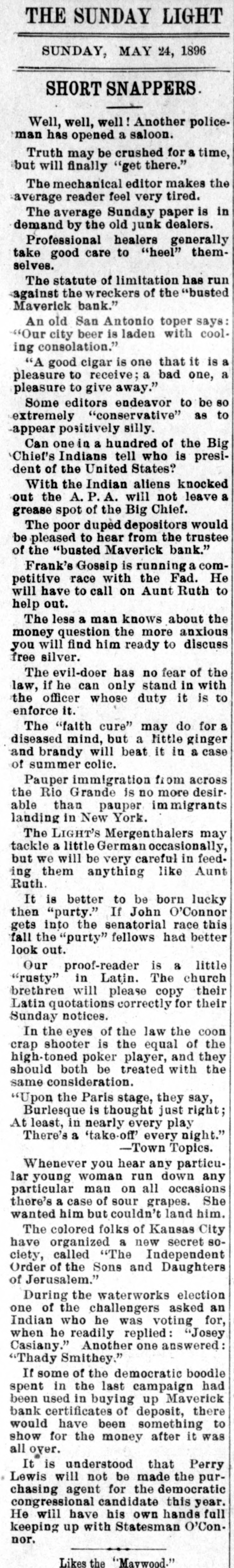 THE SUNDAY LIGHT SUNDAY, MAY 24, 1896 # SHORT SNAPPERS. Well, well, well! Another policeman has opened a saloon. Truth may be crushed for a time, but will finally "get there." The mechanical editor makes the average reader feel very tired. The average Sunday paper is in demand by the old junk dealers. Professional healers generally take good care to "heel" themselves. The statute of limitation has run against the wreckers of the "busted Maverick bank." An old San Antonio toper says: "Our city beer is laden with cooling consolation." "A good cigar is one that it is a pleasure to receive; a bad one, a pleasure to give away." Some editors endeavor to be so extremely "conservative" as to -appear positively silly. Can one in a hundred of the Big Chief's Indians tell who is president of the United States? With the Indian aliens knocked out the A. P. A. will not leave a grease spot of the Big Chief. The poor duped depositors would be pleased to hear from the trustee of the "busted Maverick bank." Frank's Gossip is running a competitive race with the Fad. He will have to call on Aunt Ruth to help out. The less a man knows about the money question the more anxious you will find him ready to discuss free silver. The evil-doer has no fear of the law, if he can only stand in with the officer whose duty it is to enforce it. The "faith cure" may do for a diseased mind, but a little ginger and brandy will beat it in a case of summer colic. Pauper immigration from across the Rio Grande is no more desirable than pauper immigrants landing in New York. The LIGHT'S Mergenthalers may tackle a little German occasionally, but we will be very careful in feeding them anything like Aunt Ruth. It is better to be born lucky then "purty." If John O'Connor gets into the senatorial race this fall the "purty" fellows had better look out. Our proof-reader is a little "rusty" in Latin. The church brethren will please copy their Latin quotations correctly for their Sunday notices. In the eyes of the law the coon crap shooter is the equal of the high-toned poker player, and they should both be treated with the same consideration. "Upon the Paris stage, they say, Burlesque is thought just right; At least, in nearly every play There's a 'take-off' every night." -Town Topics. Whenever you hear any particular young woman run down any particular man on all occasions there's a case of sour grapes. She wanted him but couldn't land him. The colored folks of Kansas City have organized a new secret society, called "The Independent Order of the Sons and Daughters of Jerusalem." During the waterworks election one of the challengers asked an Indian who he was voting for, when he readily replied: "Josey Casiany." Another one answered: "Thady Smithey." If some of the democratic boodle spent in the last campaign had been used in buying up Maverick bank certificates of deposit, there would have been something to show for the money after it was all over. It is understood that Perry Lewis will not be made the purchasing agent for the democratic congressional candidate this year. He will have his own hands full keeping up with Statesman O'Connor. Likes the "Maywood."