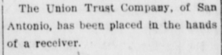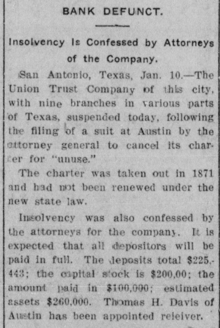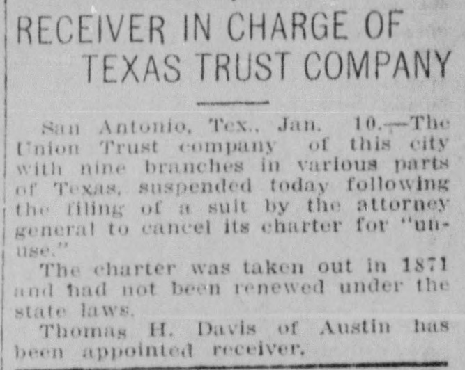 RECEIVER IN CHARGE OF TEXAS TRUST COMPANY San Antonio, Tex., Jan. 10.The Union Trust company of this city with nine branches in various parts of Texas, suspended today following the filing of a suit by the attorney general to cancel its charter for "unuse." The charter was taken out in 1871 and had not been renewed under the state laws. Thomas H. Davis of Austin has been appointed receiver,