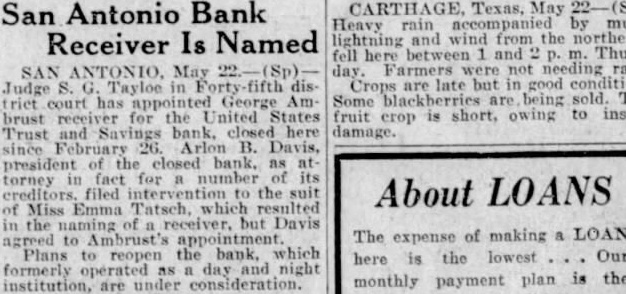 San Antonio Bank Receiver Is Named SAN May day Farmers not needing Judge Tayloe in are late but good sold The Some are being court has for the United States fruit is short, owing to brust Trust and here damage. Arlon B. Davis, president of the closed as torney in fact for number the suit About LOANS of Miss Emma Tatsch, resulted in the but Davis The of making a LOAN agreed to Ambrust's expense Plans to reopen the which lowest Our here is the formerly operated night monthly payment plan is the are