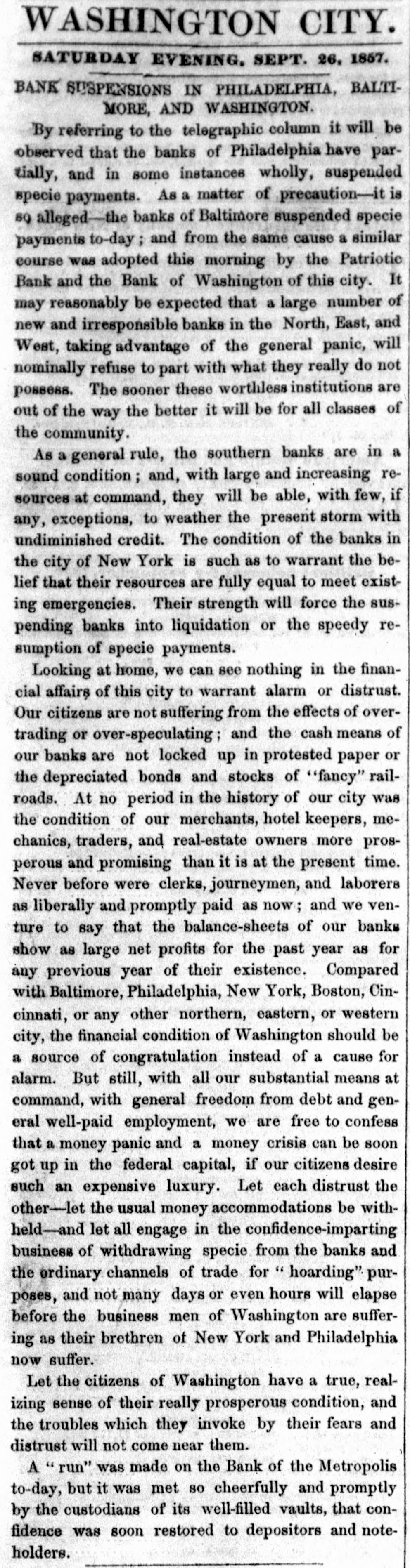 WASHINGTON CITY. SATURDAY EVENING. SEPT. 26. 1857. BANK SUSPENSIONS IN PHILADELPHIA, BALTIMORE, AND WASHINGTON. By referring to the telegraphic column it will be observed that the banks of Philadelphia have partially, and in some instances wholly, suspended specie payments. As a matter of precaution-it i is 80 alleged-the banks of Baltimore suspended specie payments to-day ; and from the same cause a similar course was adopted this morning by the Patriotic Bank and the Bank of Washington of this city. It may reasonably be expected that a large number of new and irresponsible banks in the North, East, and West, taking advantage of the general panic, will nominally refuse to part with what they really do not possess. The sooner these worthless institutions are out of the way the better it will be for all classes of the community. As a general rule, the southern banks are in a sound condition; and, with large and increasing resources at command, they will be able, with few, if any, exceptions, to weather the present storm with undiminished credit. The condition of the banks in the city of New York is such as to warrant the belief that their resources are fully equal to meet existing emergencies. Their strength will force the suspending banks into liquidation or the speedy resumption of specie payments. Looking at home, we can see nothing in the financial affairs of this city to warrant alarm or distrust. Our citizens are not suffering from the effects of overtrading or over-speculating; and the cash means of our banks are not locked up in protested paper or the depreciated bonds and stocks of "fancy" railroads. At no period in the history of our city was the condition of our merchants, hotel keepers, mechanics, traders, and real-estate owners more prosperous and promising than it is at the present time. Never before were clerks, journeymen, and laborers as liberally and promptly paid as now; and we venture to say that the balance-sheets of our banks show as large net profits for the past year as for any previous year of their existence. Compared with Baltimore, Philadelphia, New York, Boston, Cincinnati, or any other northern, eastern, or western city, the financial condition of Washington should be a source of congratulation instead of a cause for alarm. But still, with all our substantial means at command, with general freedom from debt and general well-paid employment, we are free to confess that a money panic and a money crisis can be soon got up in the federal capital, if our citizens desire such an expensive luxury. Let each distrust the other-let the usual money accommodations be withheld-and let all engage in the confidence-imparting business of withdrawing specie from the banks and the ordinary channels of trade for 'hoarding" purposes, and not many days or even hours will elapse before the business men of Washington are suffering as their brethren of New York and Philadelphia now suffer. Let the citizens of Washington have a true, realizing sense of their really prosperous condition, and the troubles which they invoke by their fears and distrust will not come near them. A "run" was made on the Bank of the Metropolis to-day, but it was met so cheerfully and promptly by the custodians of its well-filled vaults, that confidence was soon restored to depositors and noteholders.