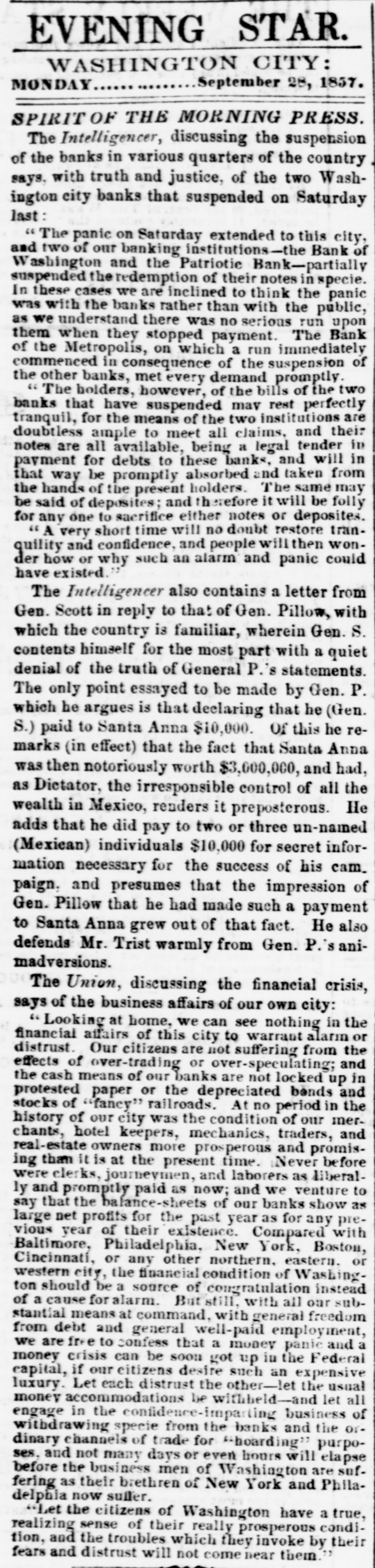 EVENING STAR. WASHINGTON CITY: September 28, 1857. MONDAY SPIRITOF THE MORNING PRESS. The Intelligencer, discussing the suspension of the banks in various quarters of the country says, with truth and justice, of the two Washington city banks that suspended on Saturday last: The panic on Saturday extended to this city, and two of our banking institutions-the Bank of Washington and the Patriotic Bank-partially suspended the redemption of their notes in specie. In these cases we are inclined to think the panic was with the banks rather than with the public, as we understand there was no serious run upon them when they stopped payment. The Bank of the Metropolis, on which a run immediately commenced in consequence of the suspension of the other banks, met every demand promptly. The holders, however, of the bills of the two banks that have suspended may rest perfectly tranquil, for the means of the two institutions are doubtless ample to meet all claims, and their notes are all available, being a legal tender in payment for debts to these banks, and will in that way be promptly absorbed and taken from the hands of the present holders. The same may be said of deposites; and erefore it will be folly for any one to sacrifice either notes or deposites. A very short time will no doubt restore tranquility and confidence, and people will then wonder how or why such an alarm and panic could have existed.' The Intelligencer also contains a letter from Gen. Scott in reply to that of Gen. Pillow, with which the country is familiar, wherein Gen. S. contents himself for the most part with a quiet denial of the truth of General P.'s statements. The only point essayed to be made by Gen. P. which he argues is that declaring that he (Gen. S.) paid to Santa Anna $10,000. Of this he remarks (in effect) that the fact that Santa Anna was then notoriously worth $3,000,000, and had, as Dictator, the irresponsible control of all the wealth in Mexico, renders it preposterous. He adds that he did pay to two or three un-named (Mexican) individuals $10,000 for secret information necessary for the success of his cam. paign. and presumes that the impression of Gen. Pillow that he had made such a payment to Santa Anna grew out of that fact. He also defends Mr. Trist warmly from Gen. P.'s animadversions. The Union, discussing the financial crisis, says of the business affairs of our own city: " Looking at home, we can see nothing in the financial affairs of this city to warrant alarm or distrust. Our citizens are not suffering from the effects of over-trading or over-speculating; and the cash means of our banks are not locked up in protested paper or the depreciated bonds and stocks of "fancy" railroads. At no period in the history of our city was the condition of our merchants, hotel keepers, mechanics, traders, and real-estate owners more prosperous and promising than it is at the present time. Never before were clerks, journeymen, and laborers as liberally and promptly paid as now; and we venture to say that the balance-sheets of our banks show as large net profits for the past year as for any previous year of their existence. Compared with Baltimore, Philadelphia, New York, Boston, Cincinnati, or any other northern, eastern. or western city, the financial condition of Washington should be a source of congratulation instead of a cause for alarm. But still, with all our substantial means at command, with general freedom from debt and general well-paid employment, we are free to confess that a money panic and a money crisis can be soon got up in the Federal capital, if our citizens desire such an expensive luxury. Let each distrust the other-let the usual money accommodations be withheld-and let all engage in the confidence-imparting business of withdrawing specie from the banks and the ordinary channels of trade for "hoarding" purposes, and not many days or even hours will elapse before the business men of Washington are suffering as their brethren of New York and Philadelphia now suffer. "Let the citizens of Washington have a true, realizing sense of their really prosperous condition, and the troubles which they invoke by their fears and distrust will not come near them.